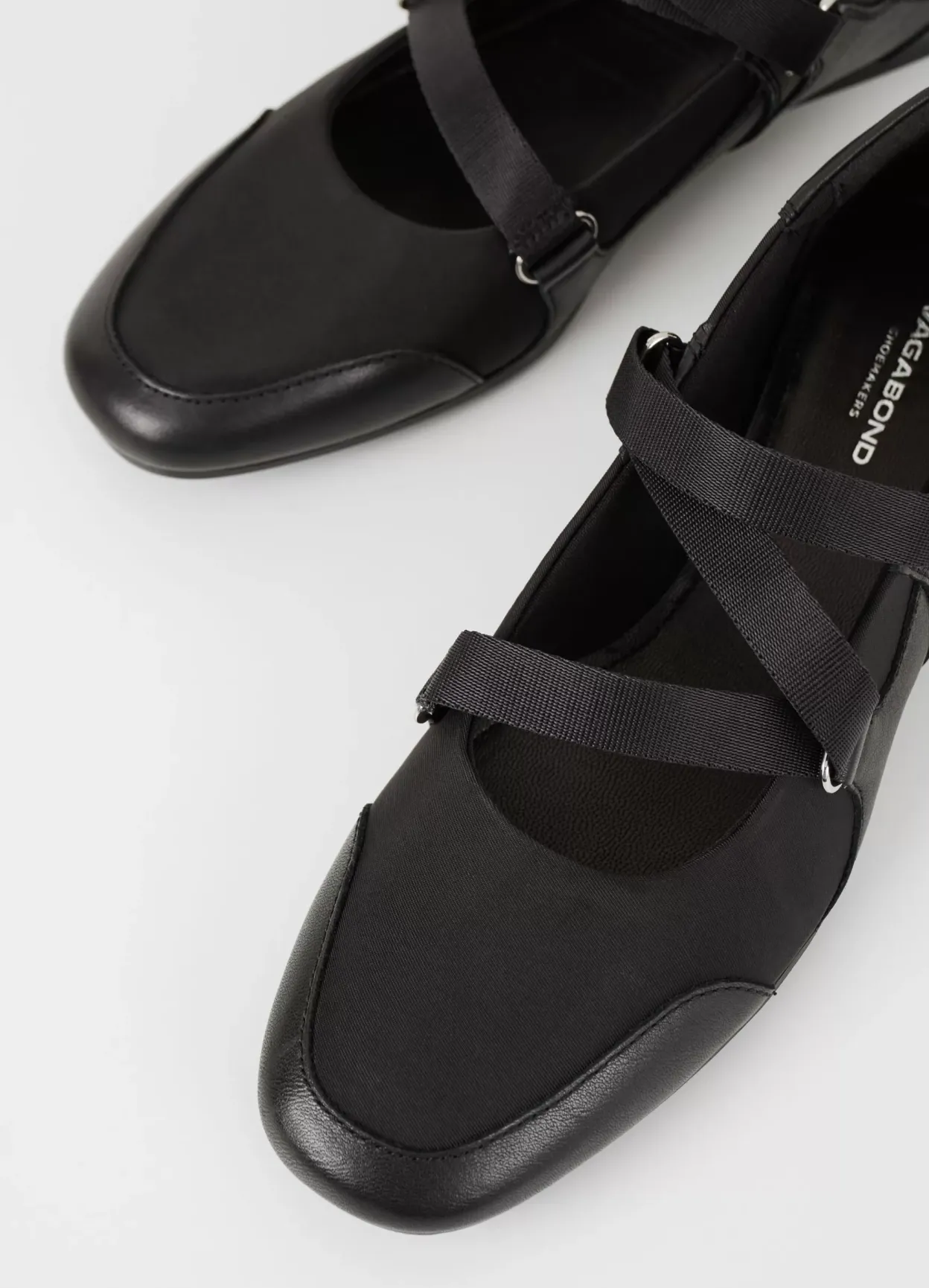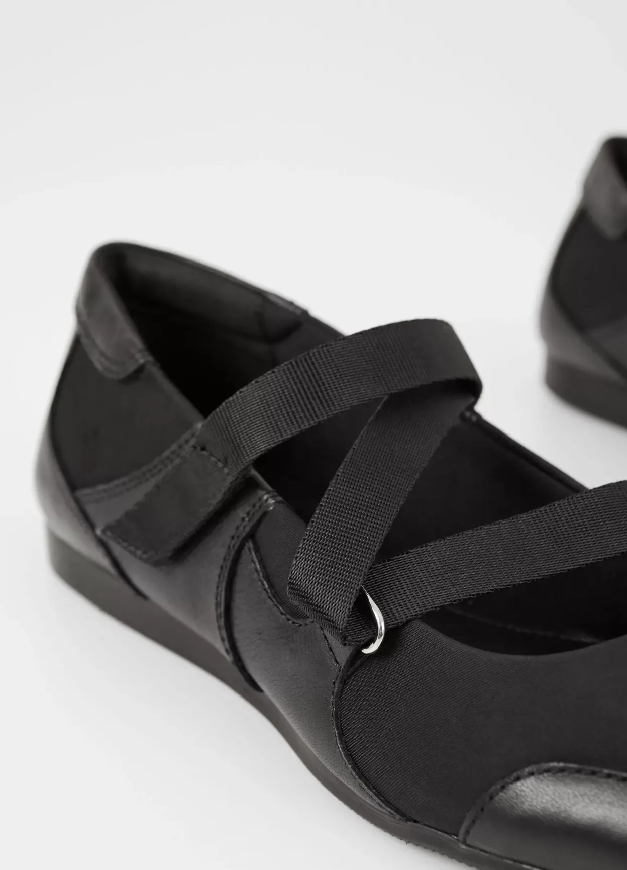 Hillary er ballerinasko med et sporty look. Modellen er lavet i sort tekstil med sorte læderpaneler samt en justerbar rem med vellcrolukning over foden. Detaljen: rund tåform og en tynd sål på 10 mm.