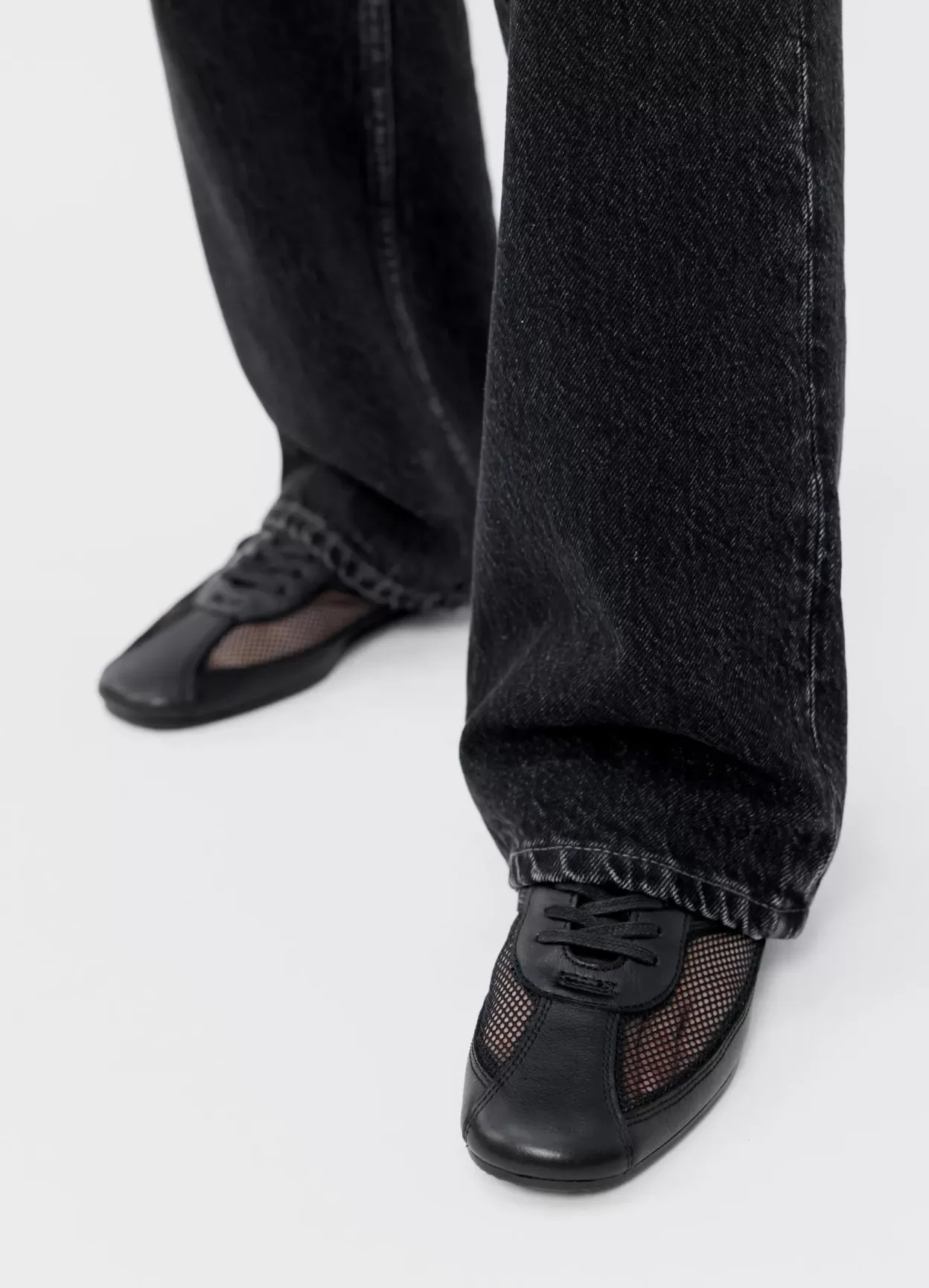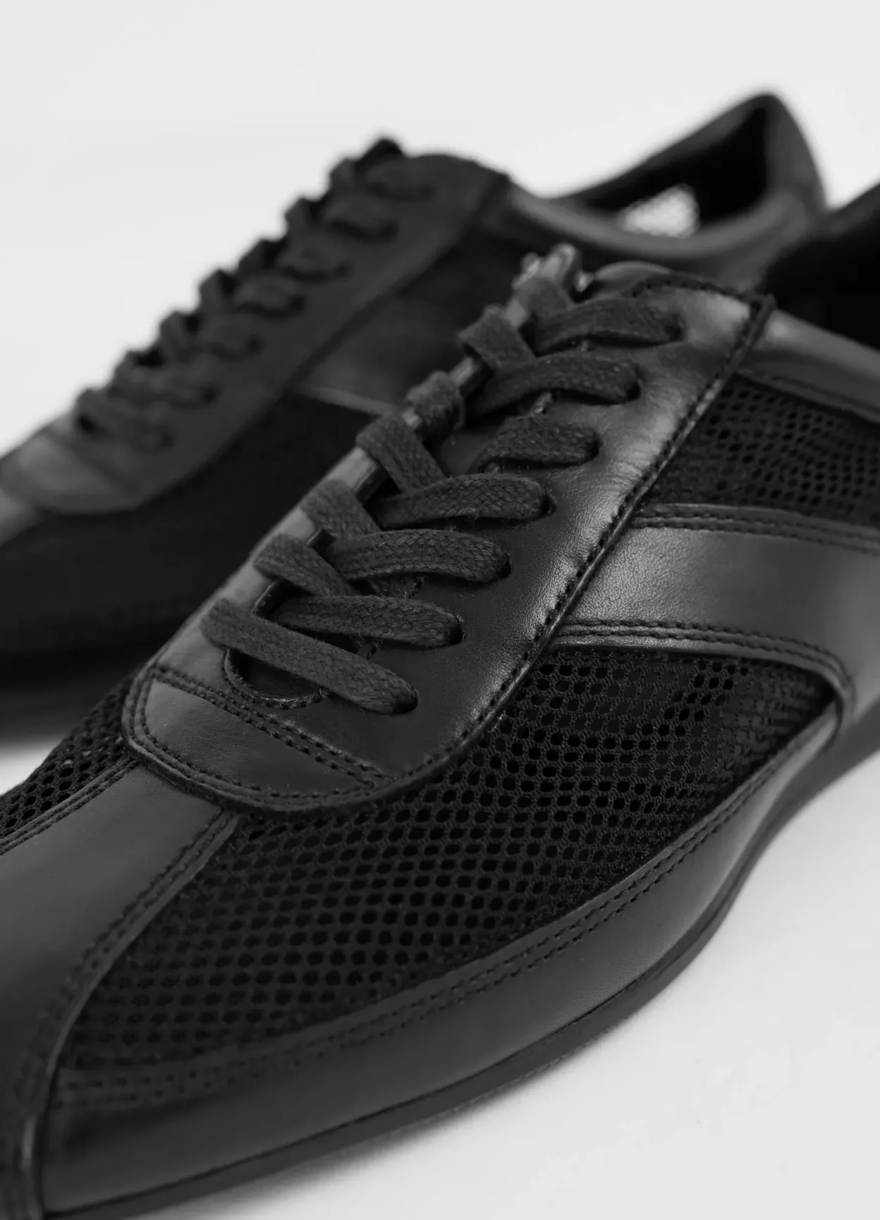 Hillary er en hybrid mellem flats og sneakers. Modellen er lavet i sort læder/tekstil med paneler i mesh samt snørebånd. Den fine sål er 10 mm.