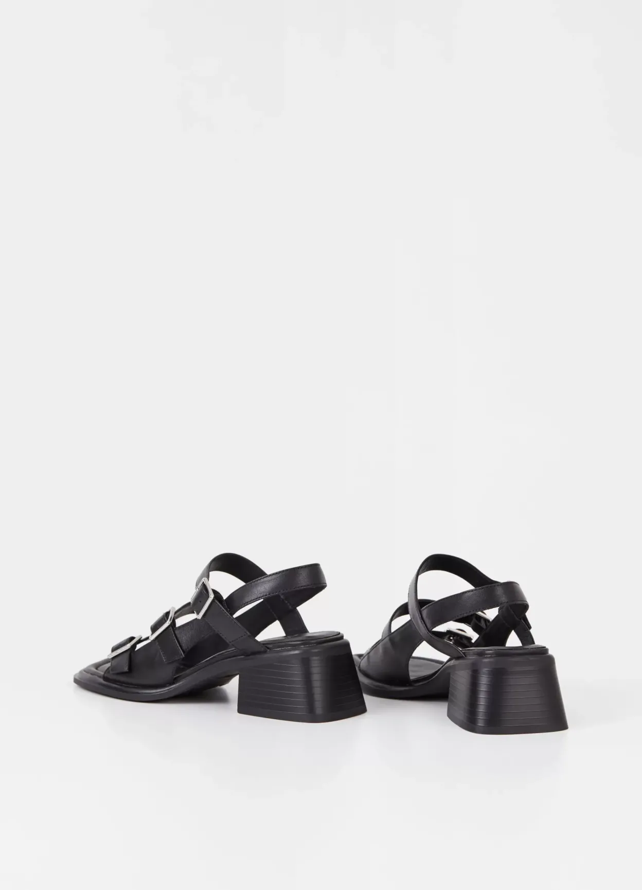 Ines er stilfulkde remsandaler med sølvfarvede spænder. Modellen er lavet i sort læder med tre justerbare remme over foden, hælremme samt firkantet tåform. Den brede hæl er 53 mm. Detaljen: en let polstret indersål i læder.