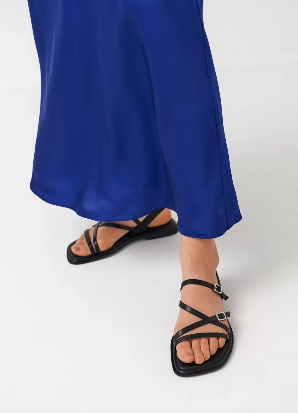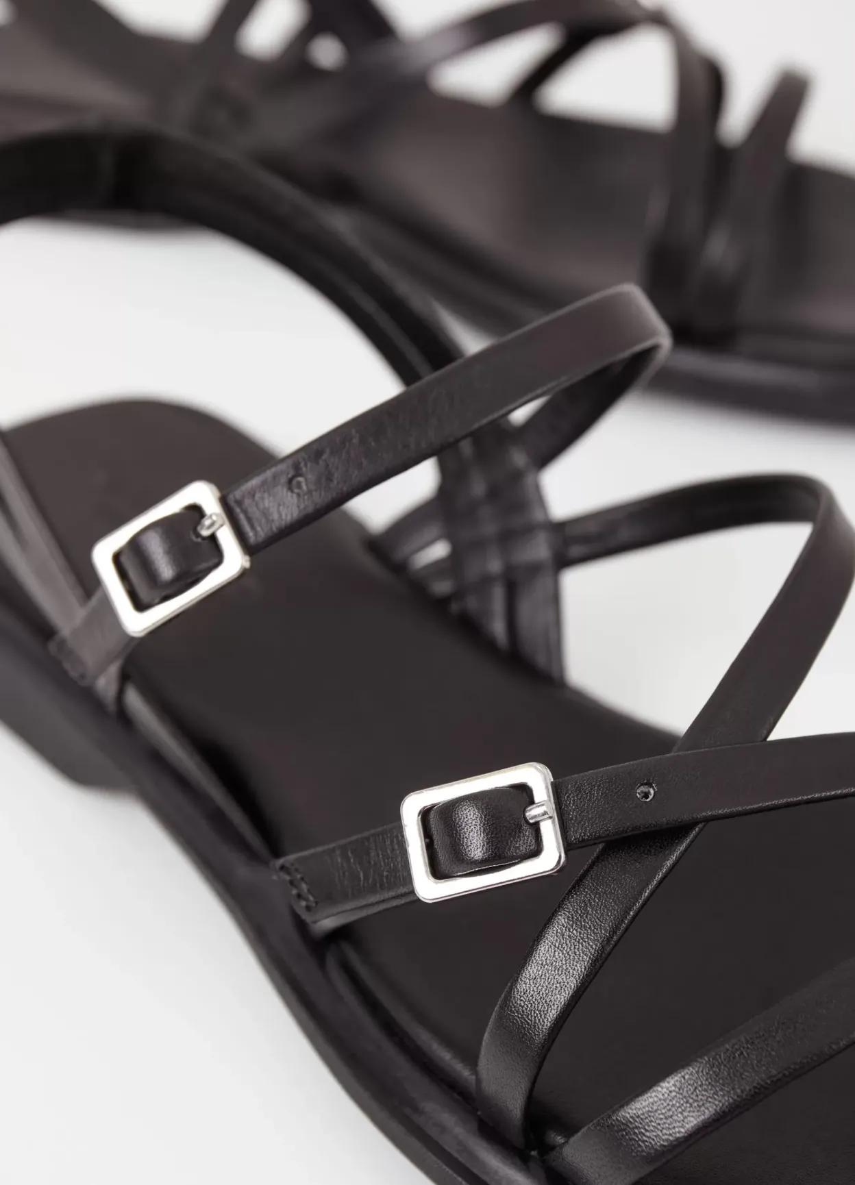 Izzy er klassiske remsandaler med en opdateret silhuet. Modellen er i sort læder med smalle remme over foden, polstret indersål og firkantet tå. Modellen har justerbar ankelrem og en 20 mm ydersål.