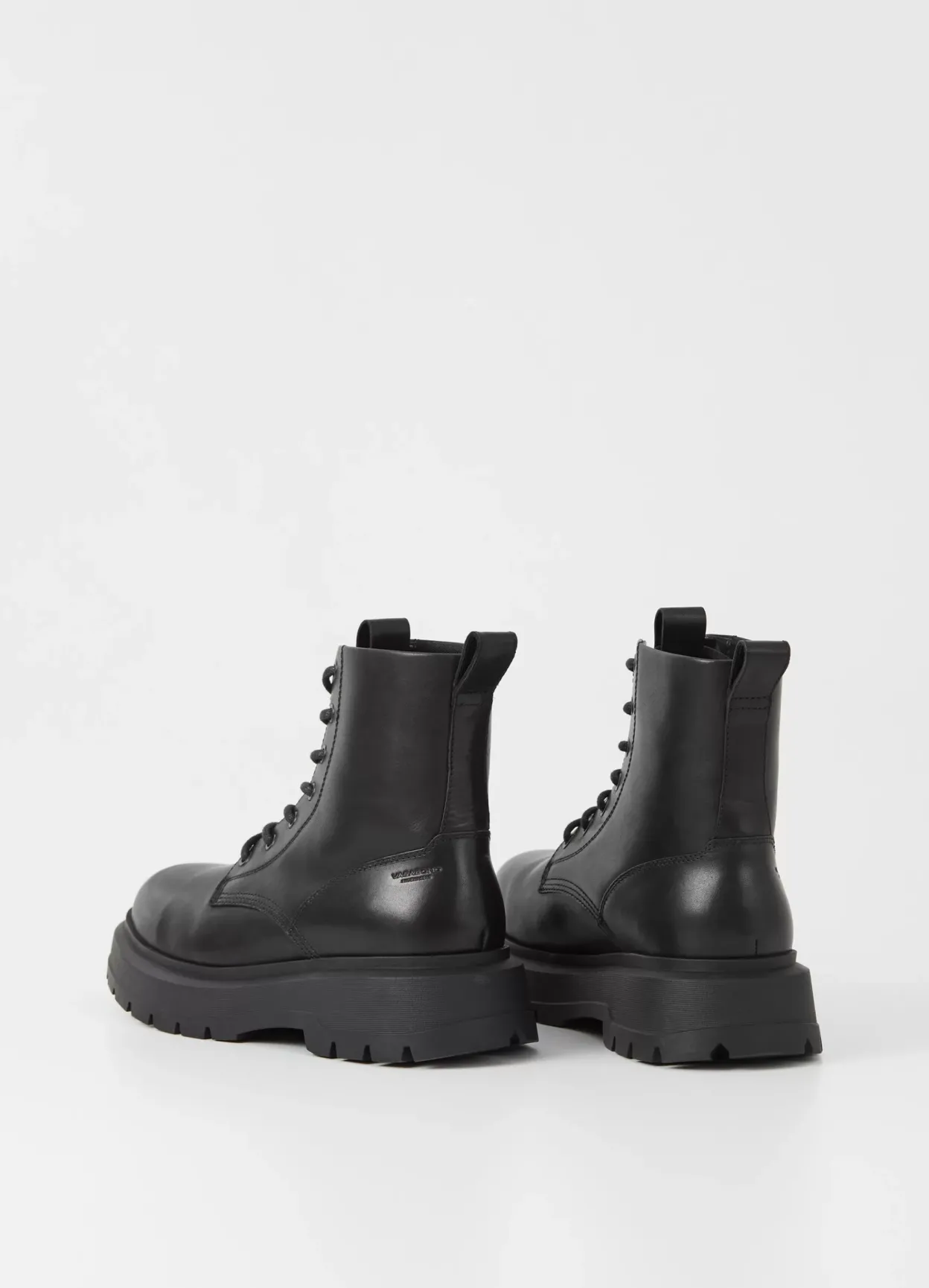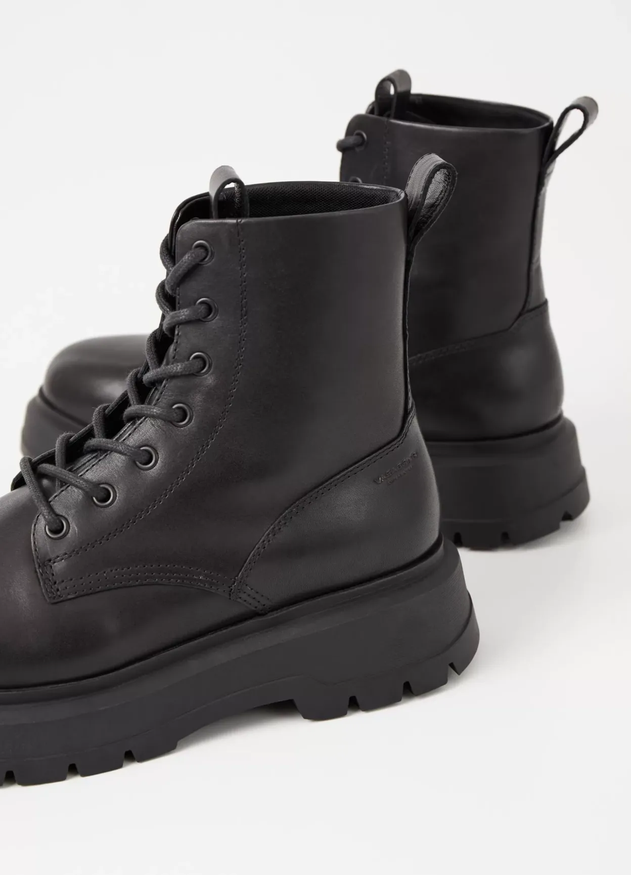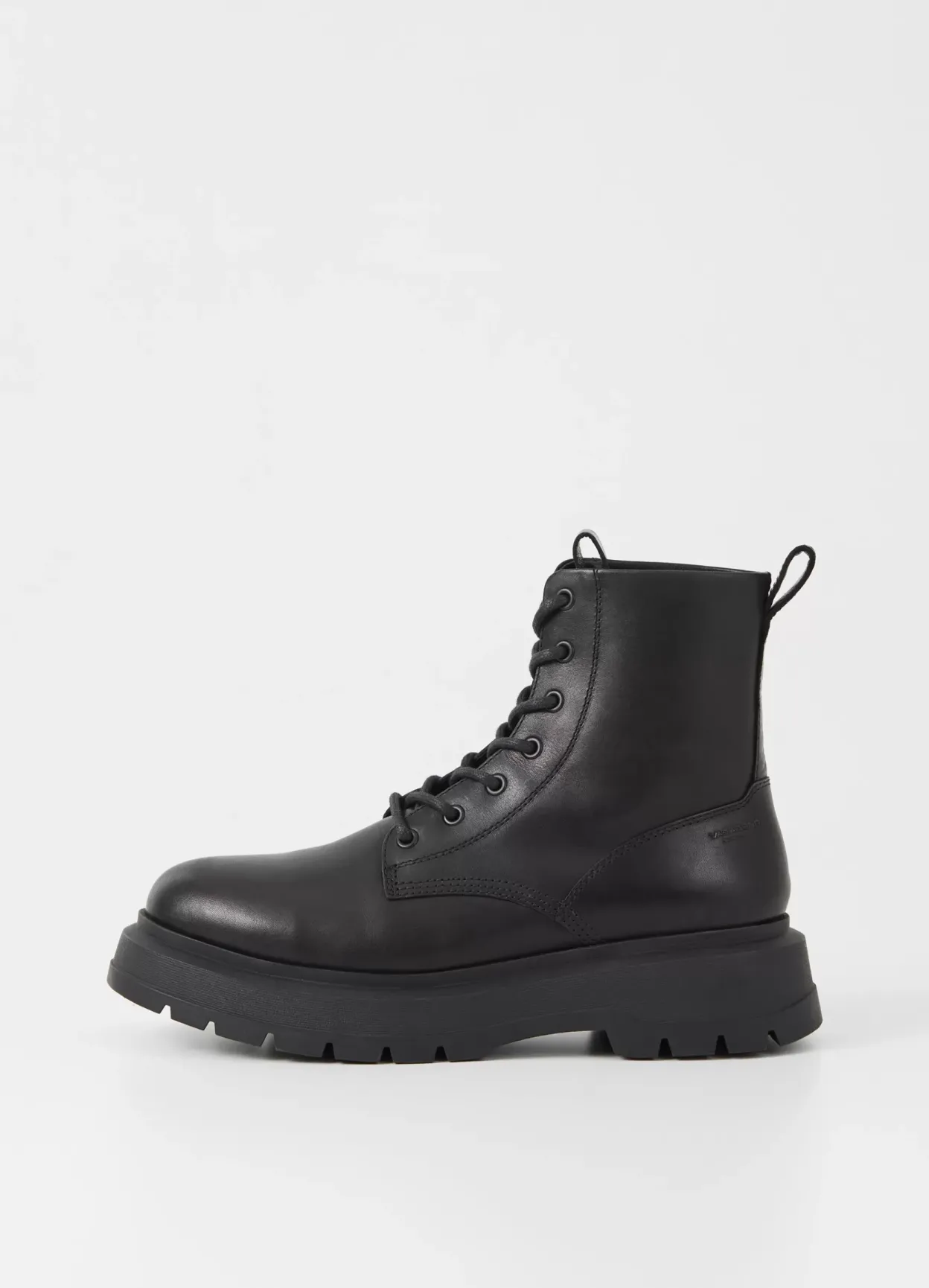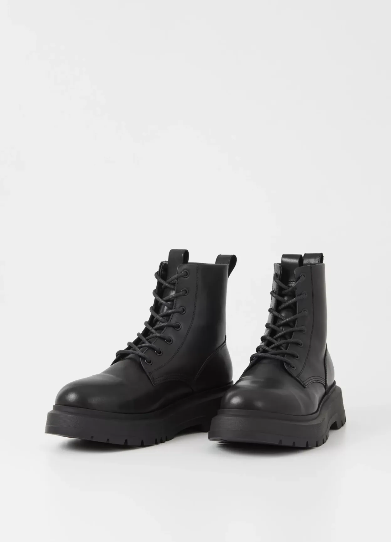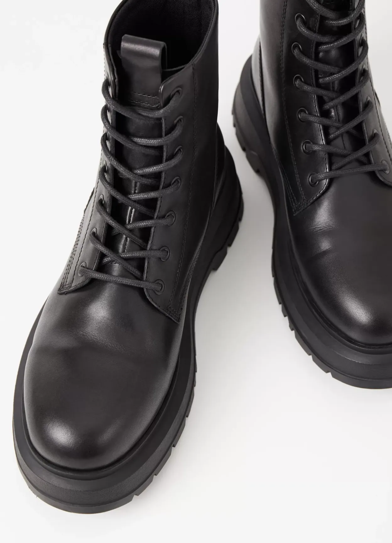Jeff er sæsonens chunky utilityboots. Modellen er i sort læder med rund tå, trækflap og snøre fortil. Den kraftige gummisål er på 47 mm.