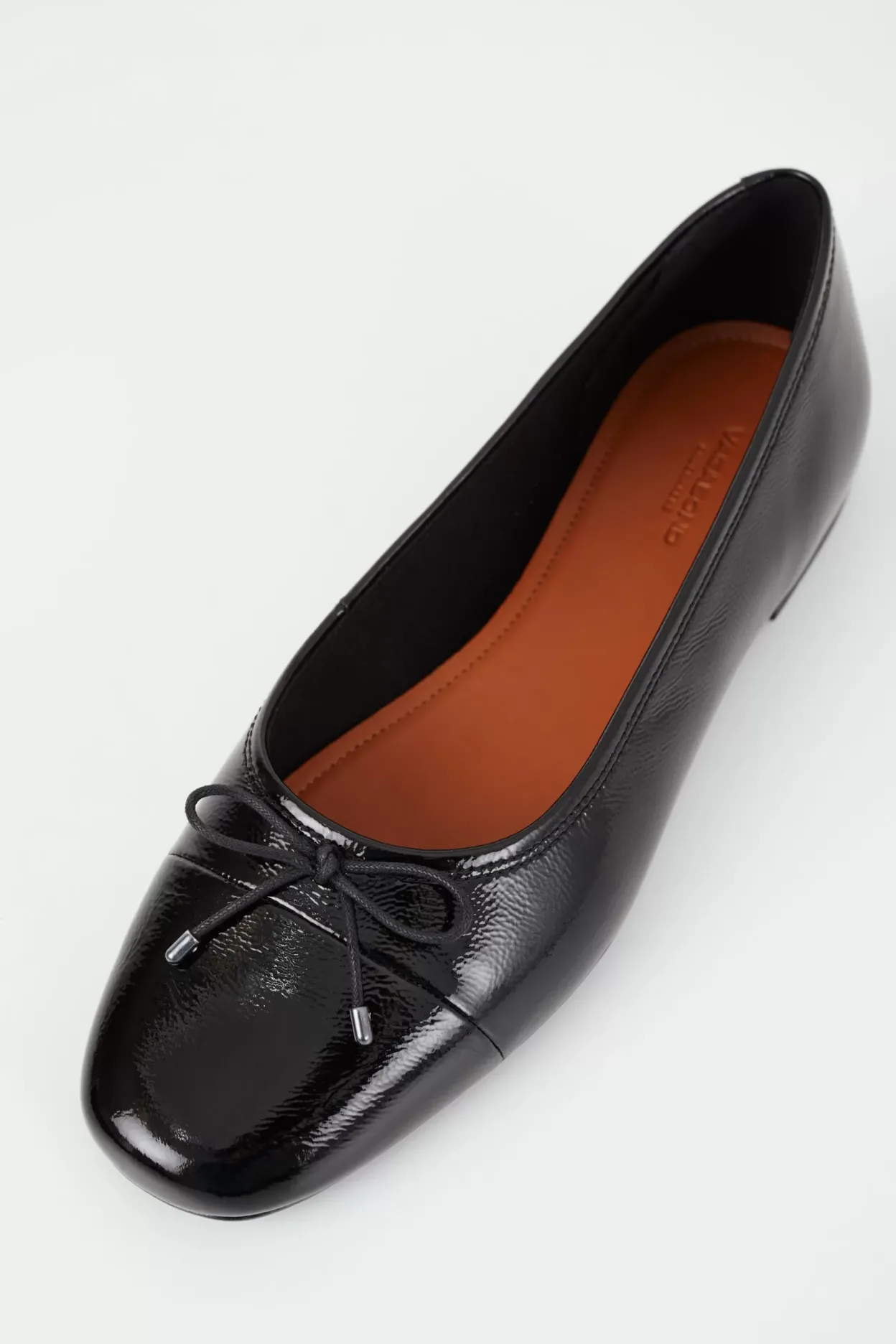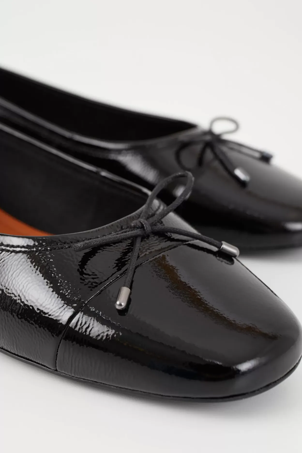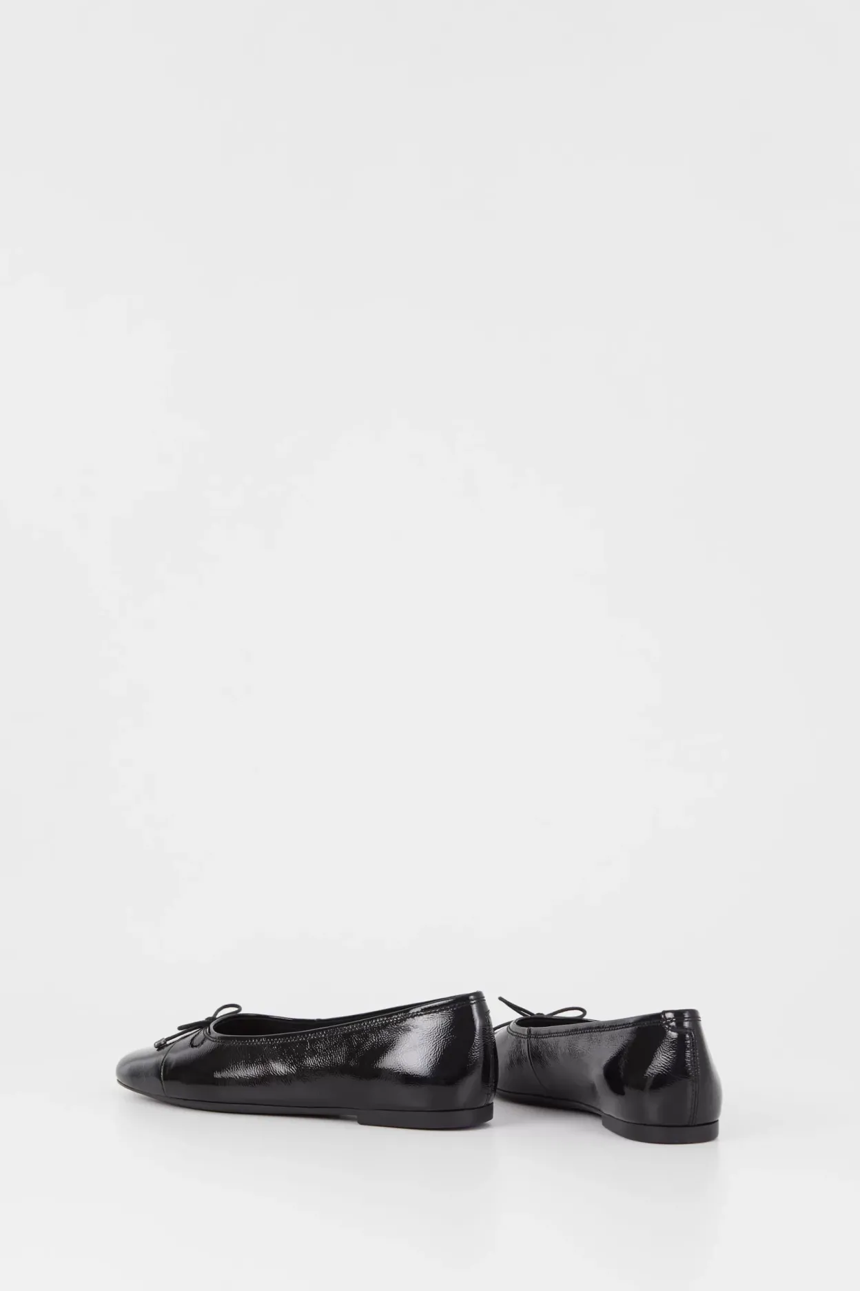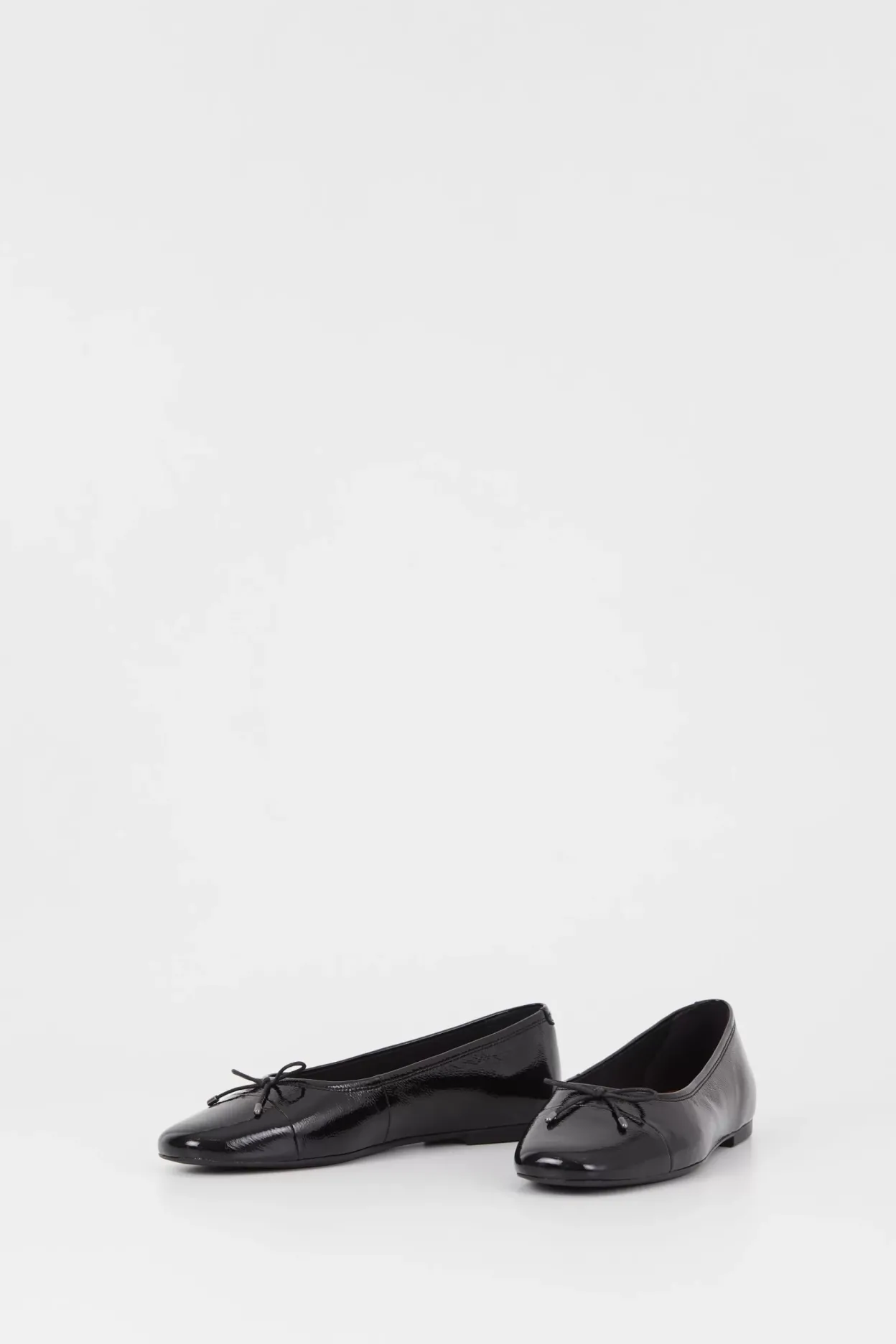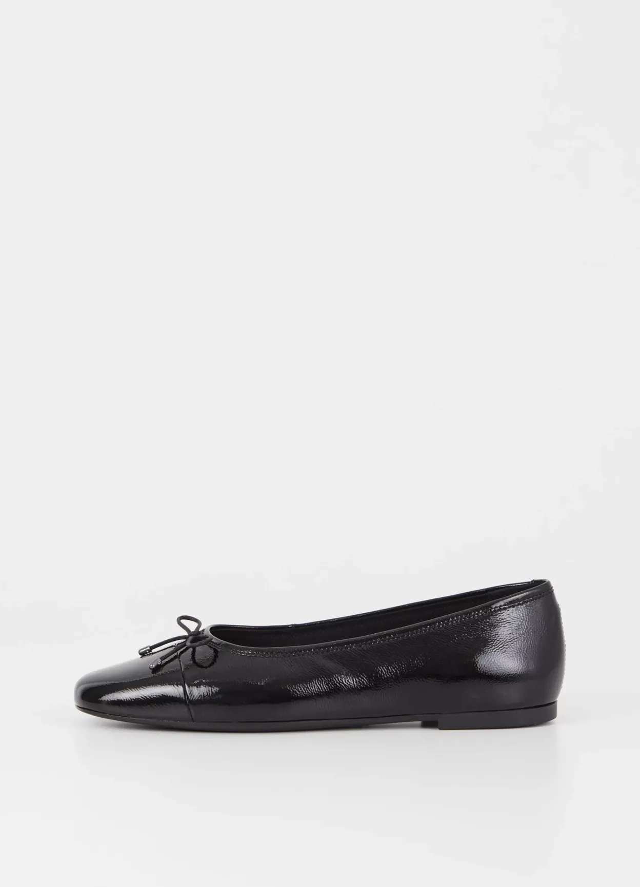 Jolin er en klædelig ballerinasko med et clean look. Den kommer i sort læder med højglans, rund tåform og en dekorativ sløjfe med detaljer i metal. De lave hæle måler 11 mm.