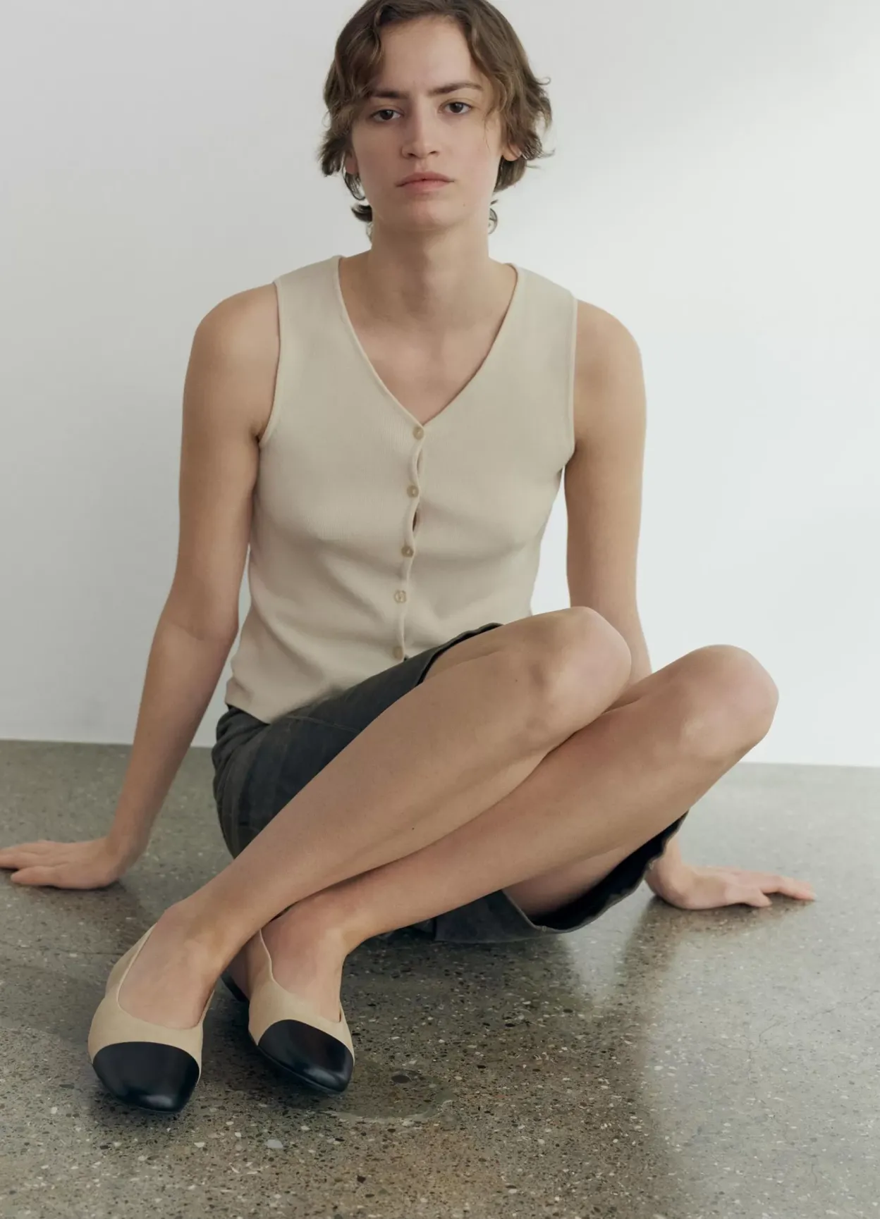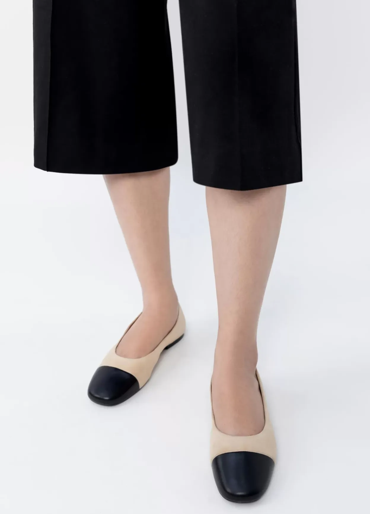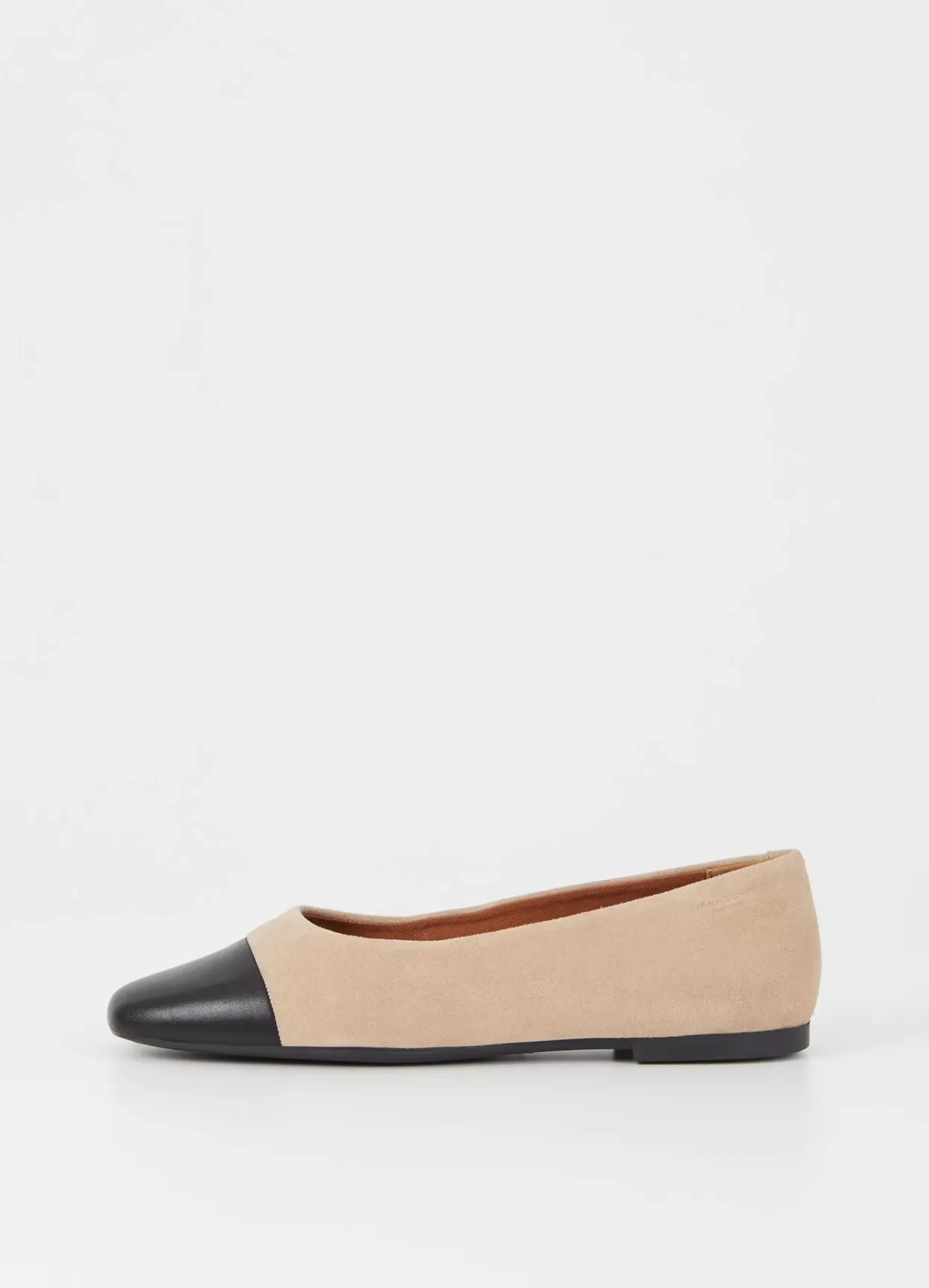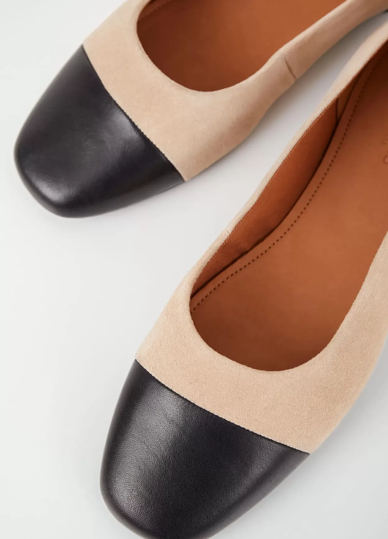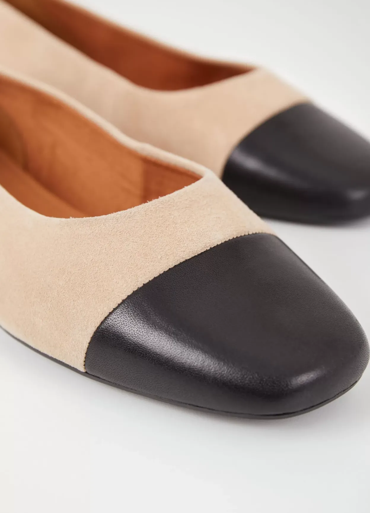 Jolin er stilrene ballerinas med et tidløst look. Modellen er i beige ruskind dekoreret med en tåhætte i sort læder og er med rund tå. Den slanke sål har en 11 mm lav hæl.