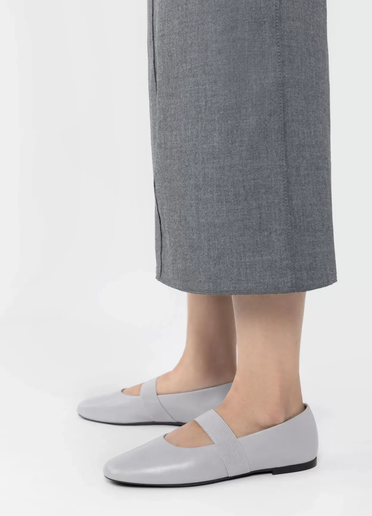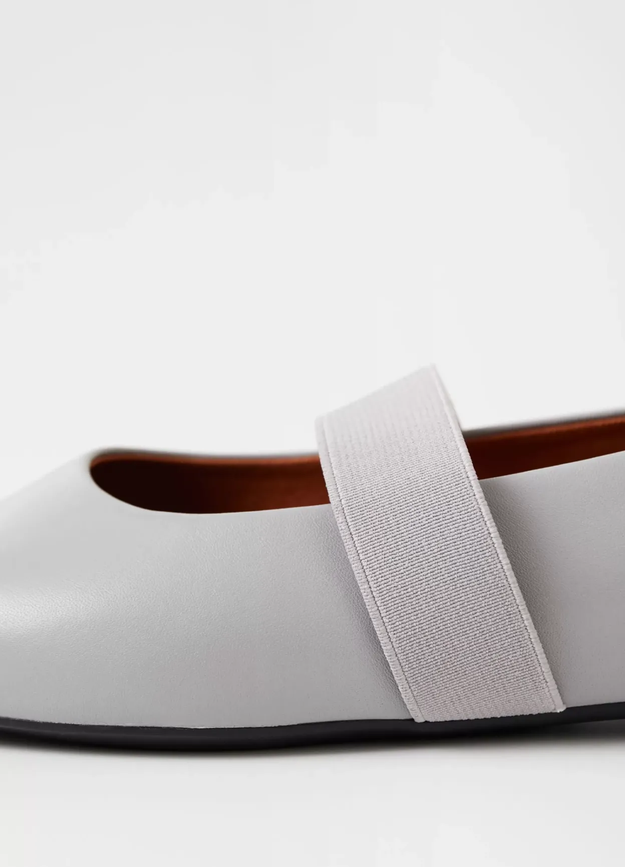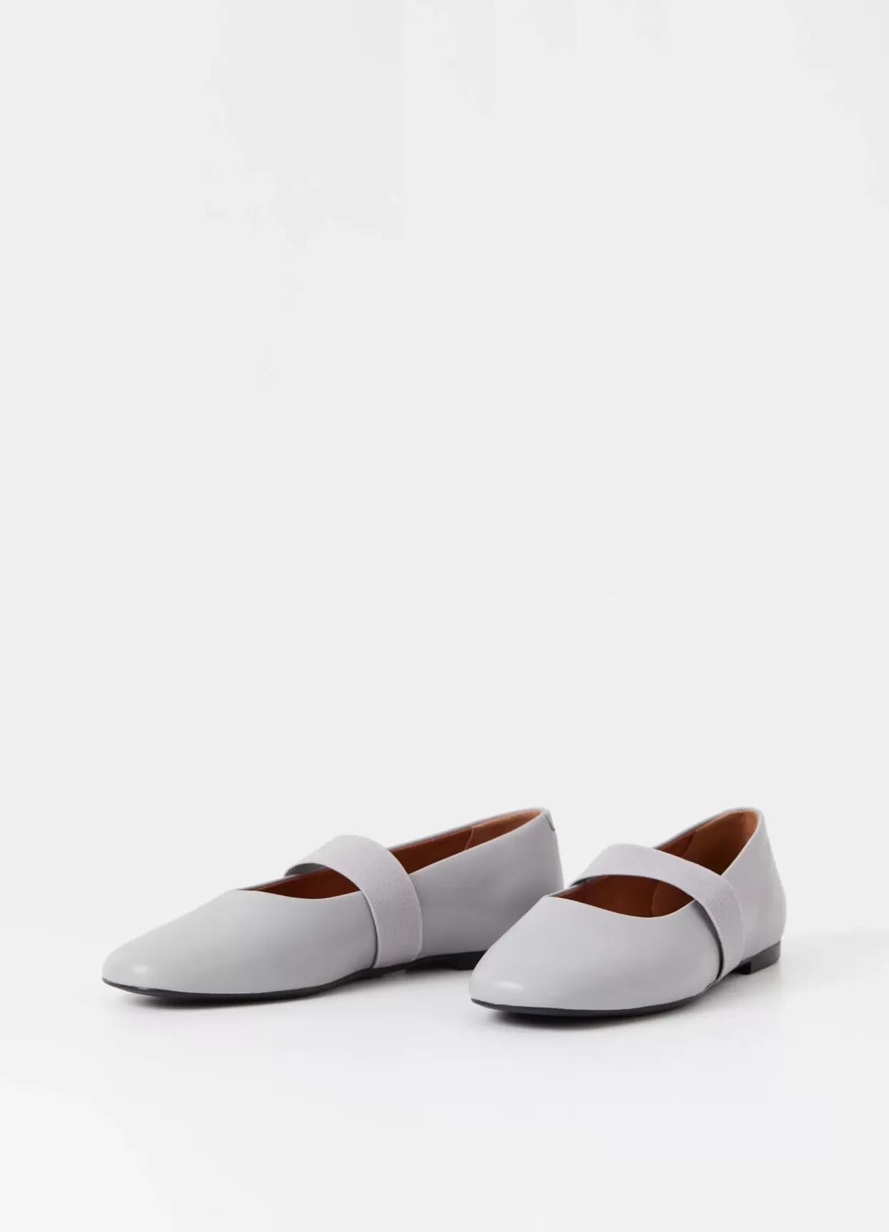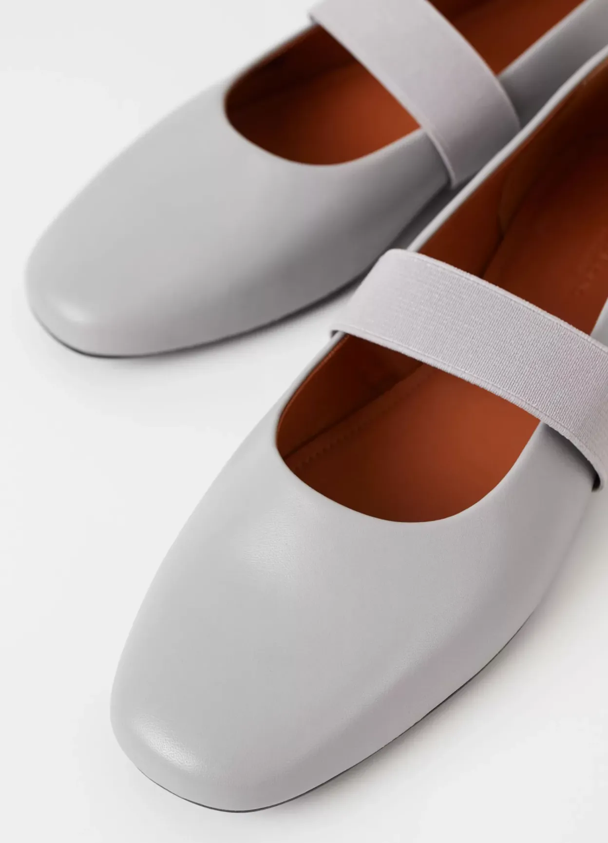 Jolin er tidløse ballerinasko i et minimalistisk design. Modellen er lavet i gråblåt læder med rund tå og en elastisk rem over foden. Den tynde sål er på 11 mm. Detaljen: tekstilfor og indersål i læder.