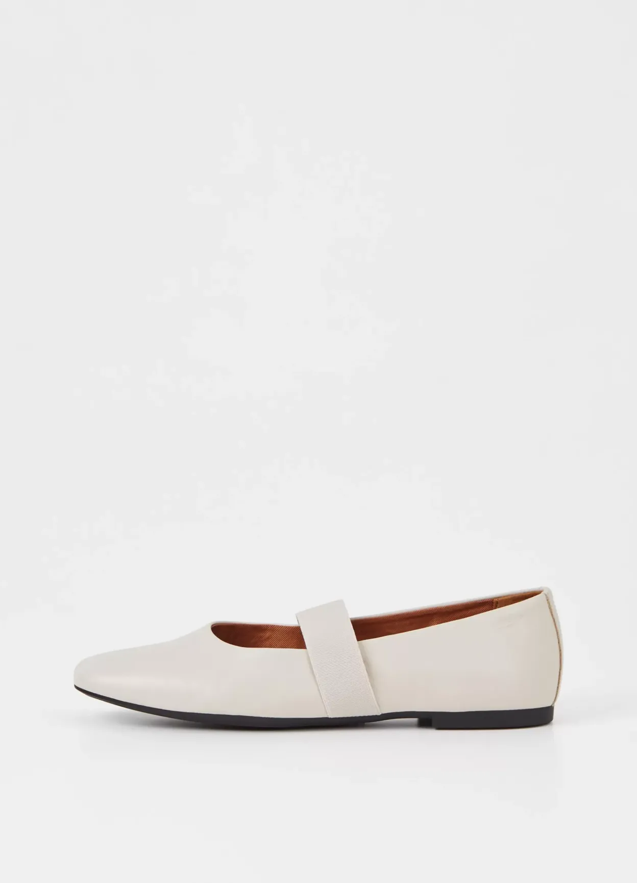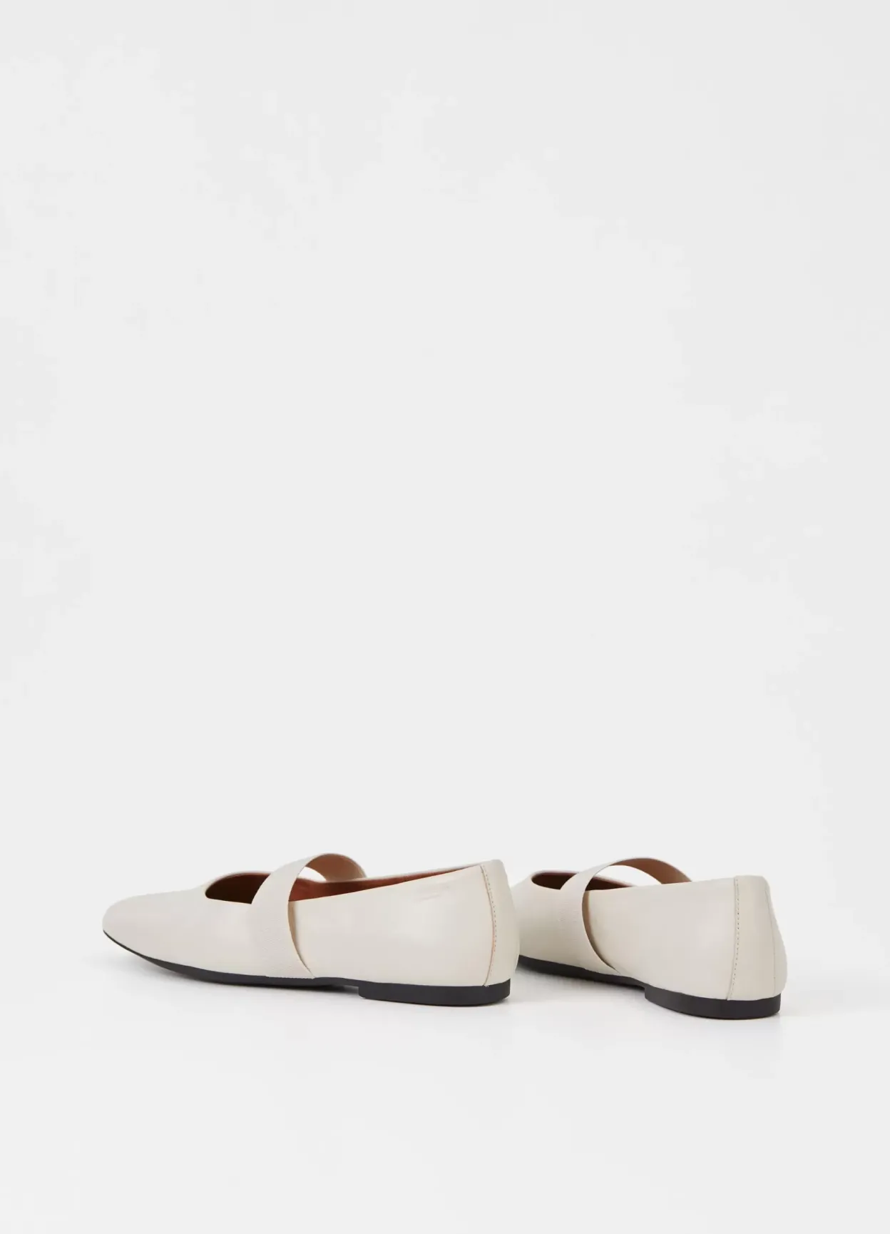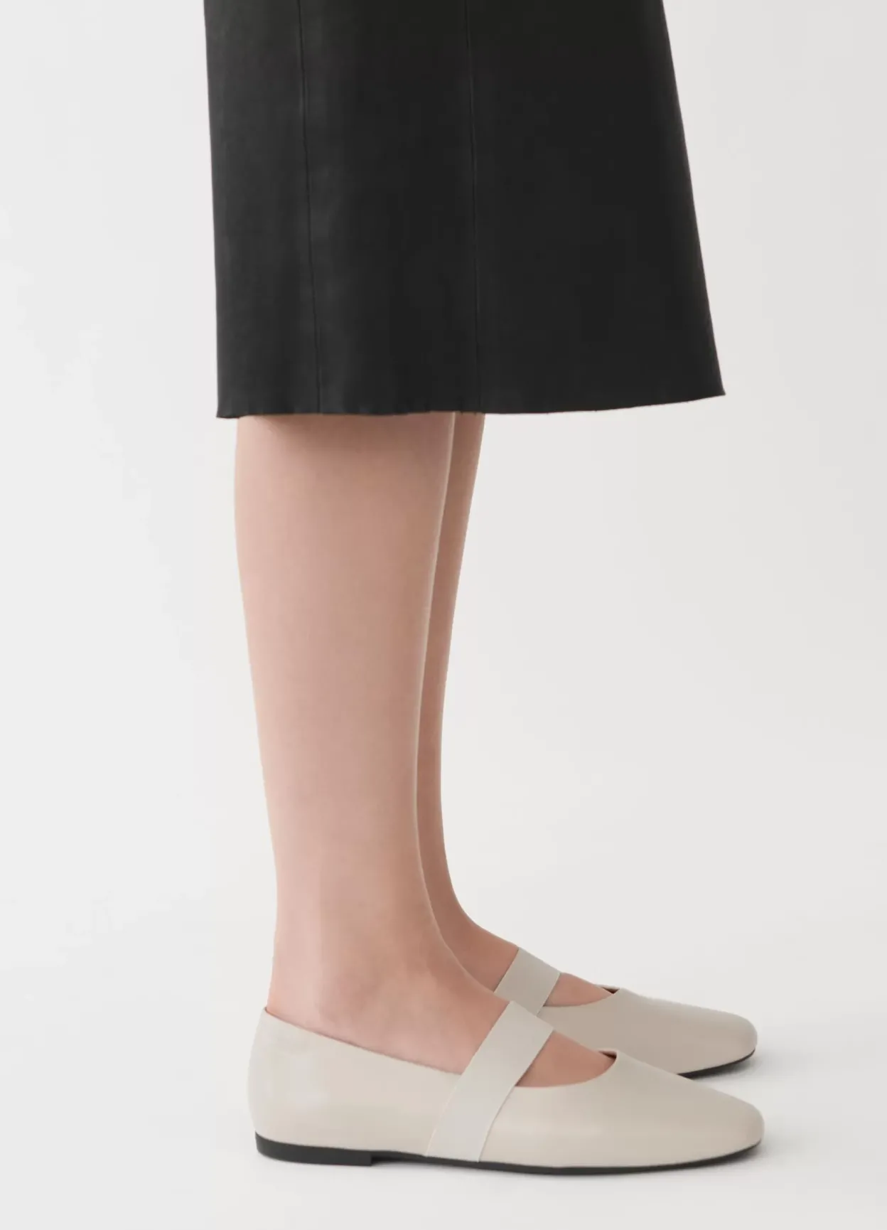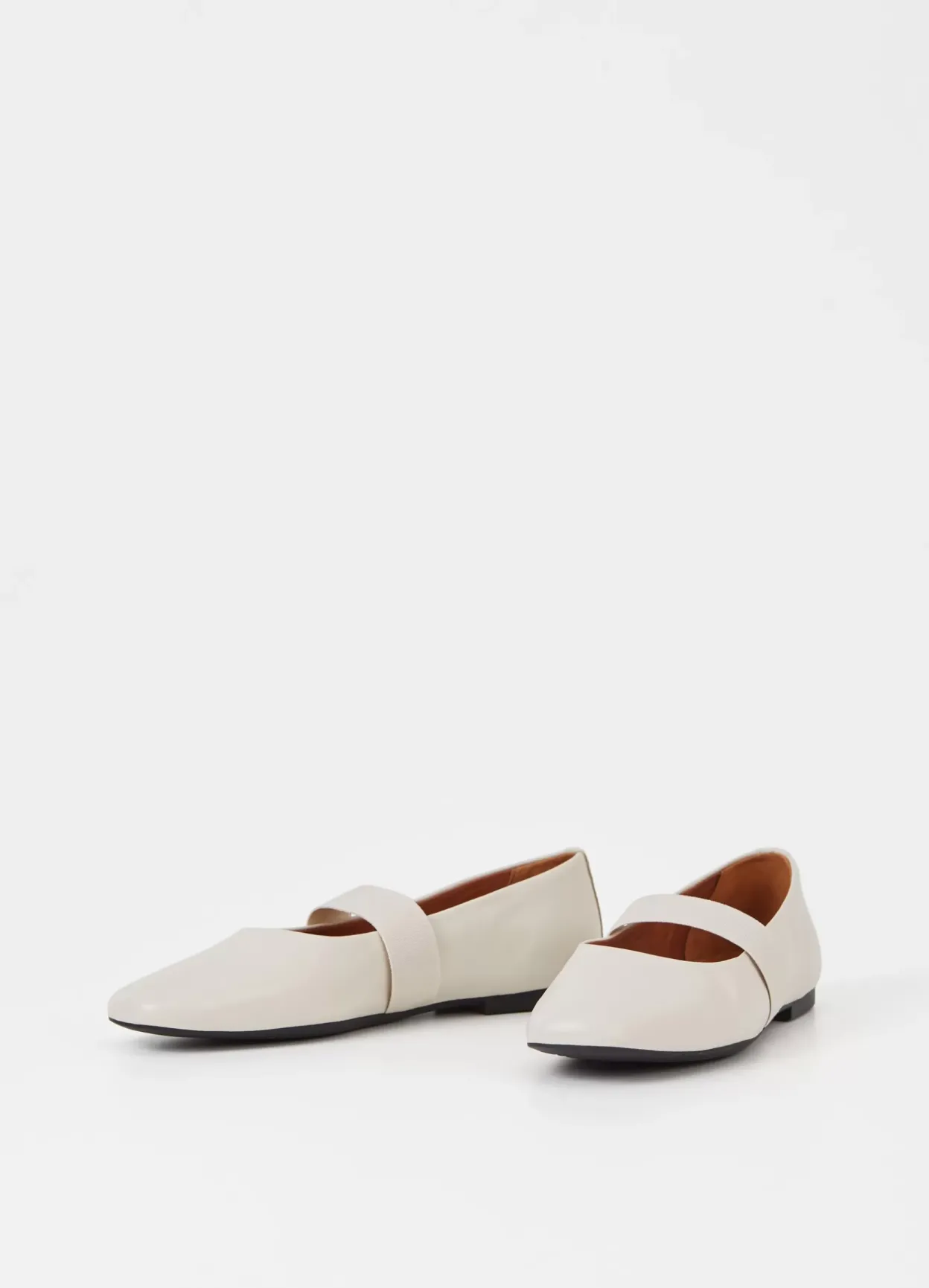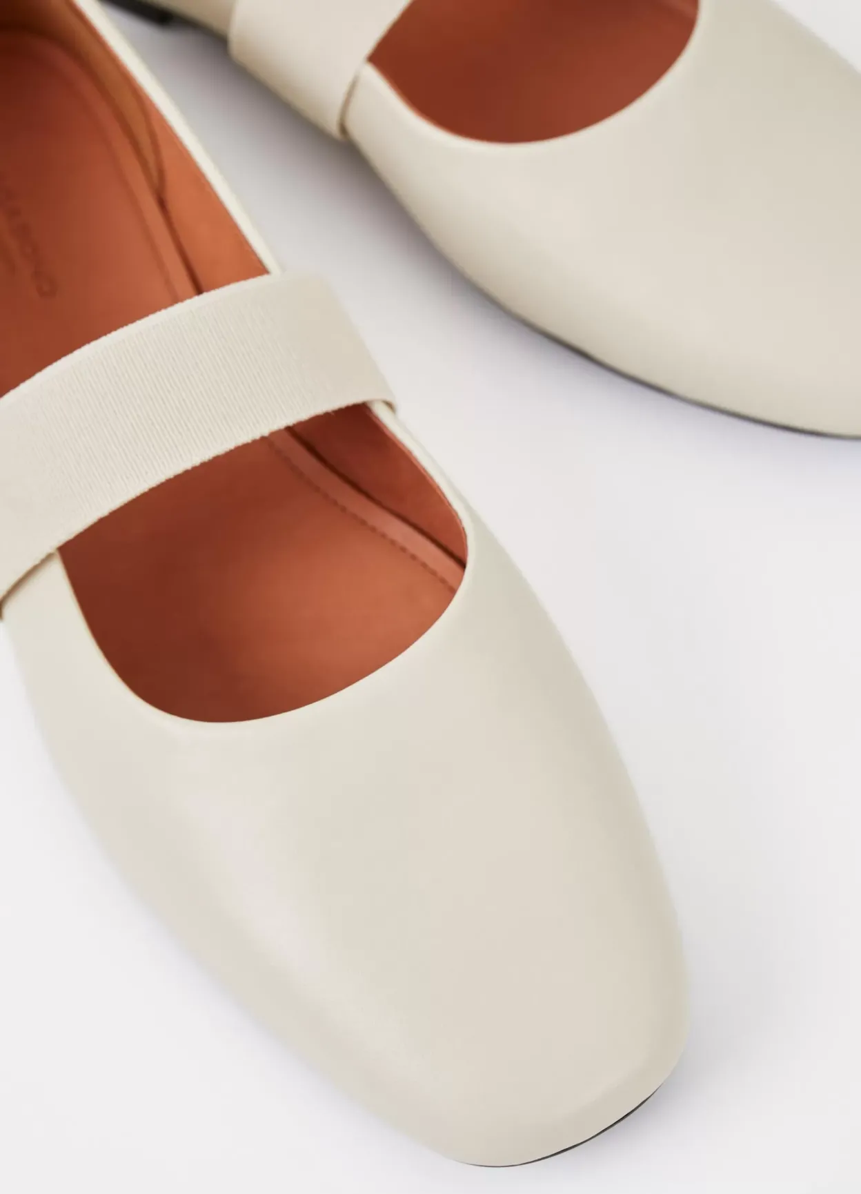 Jolin er tidløse ballerinasko med et opdateret design. Modellen er i off-white læder med rund tå, en elastisk rem, som går over foden, samt en slank sål med en lav hæl på 11 mm.