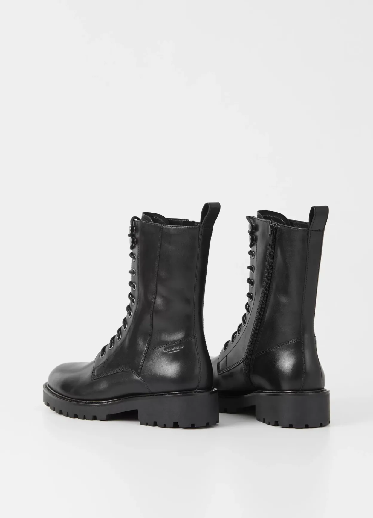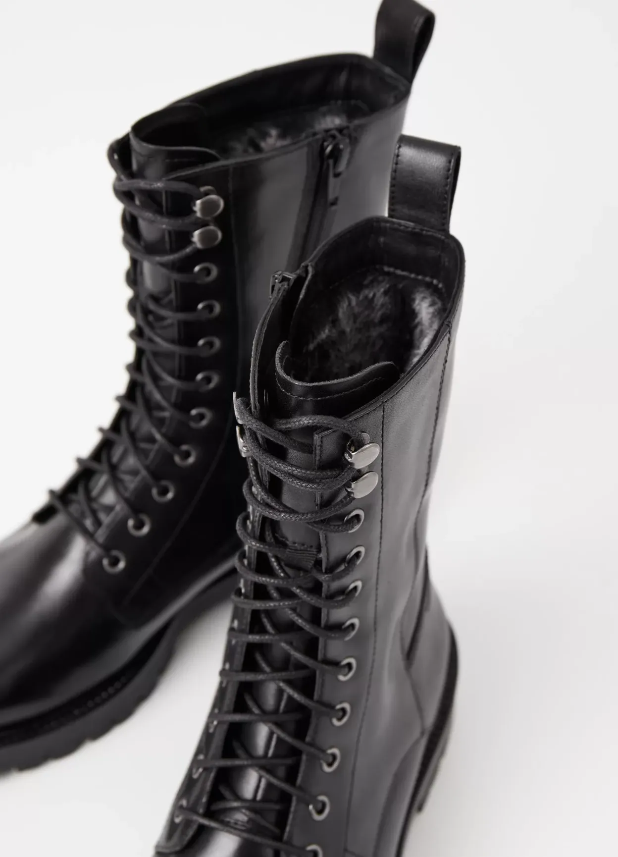 Kenova er varmforede utility-boots med et tidløst design Modellen er i sort skind med varmt for, lynlås og snøre fortil. Den kraftige ydersål har en grov hæl på 40 mm.