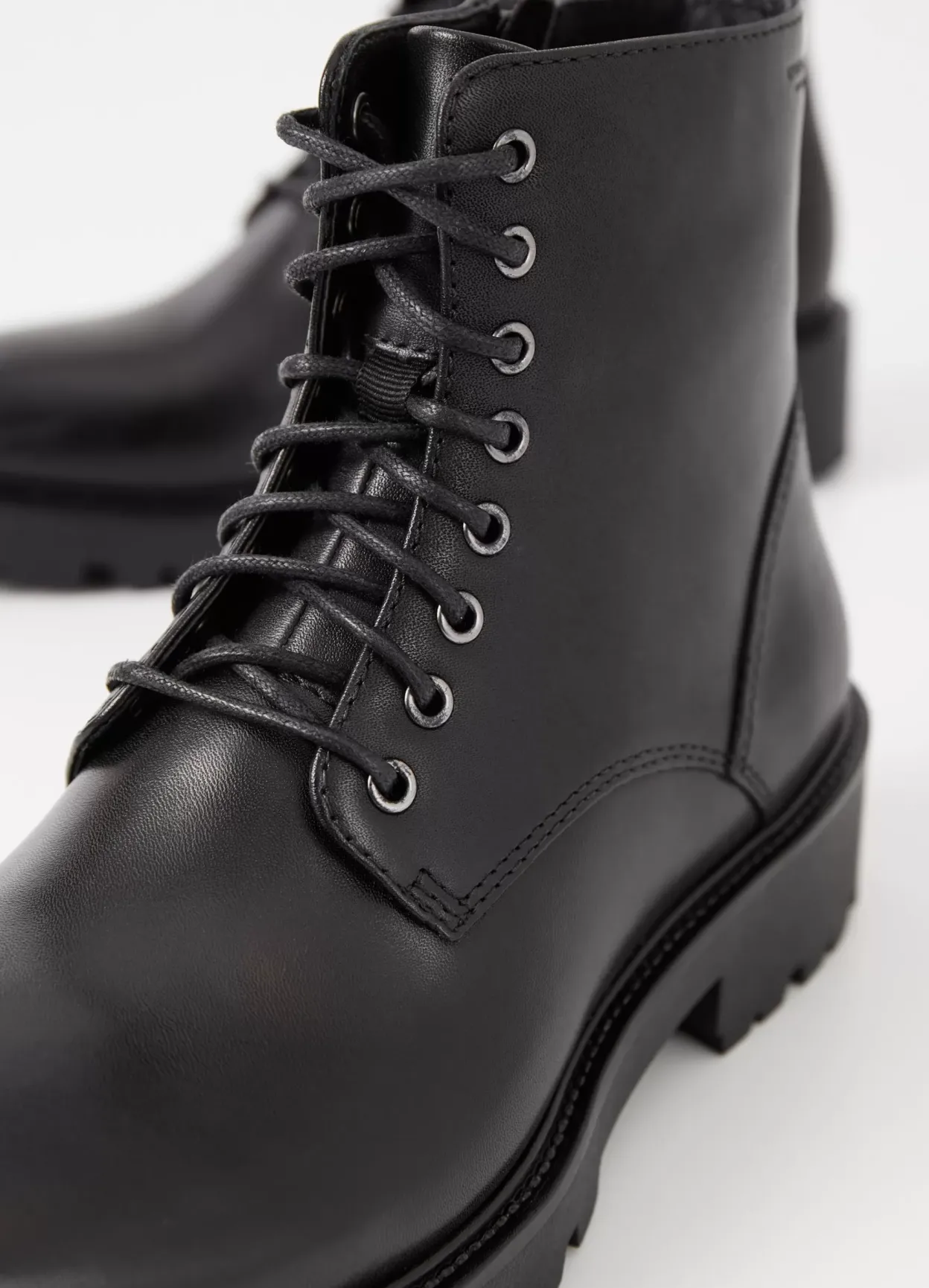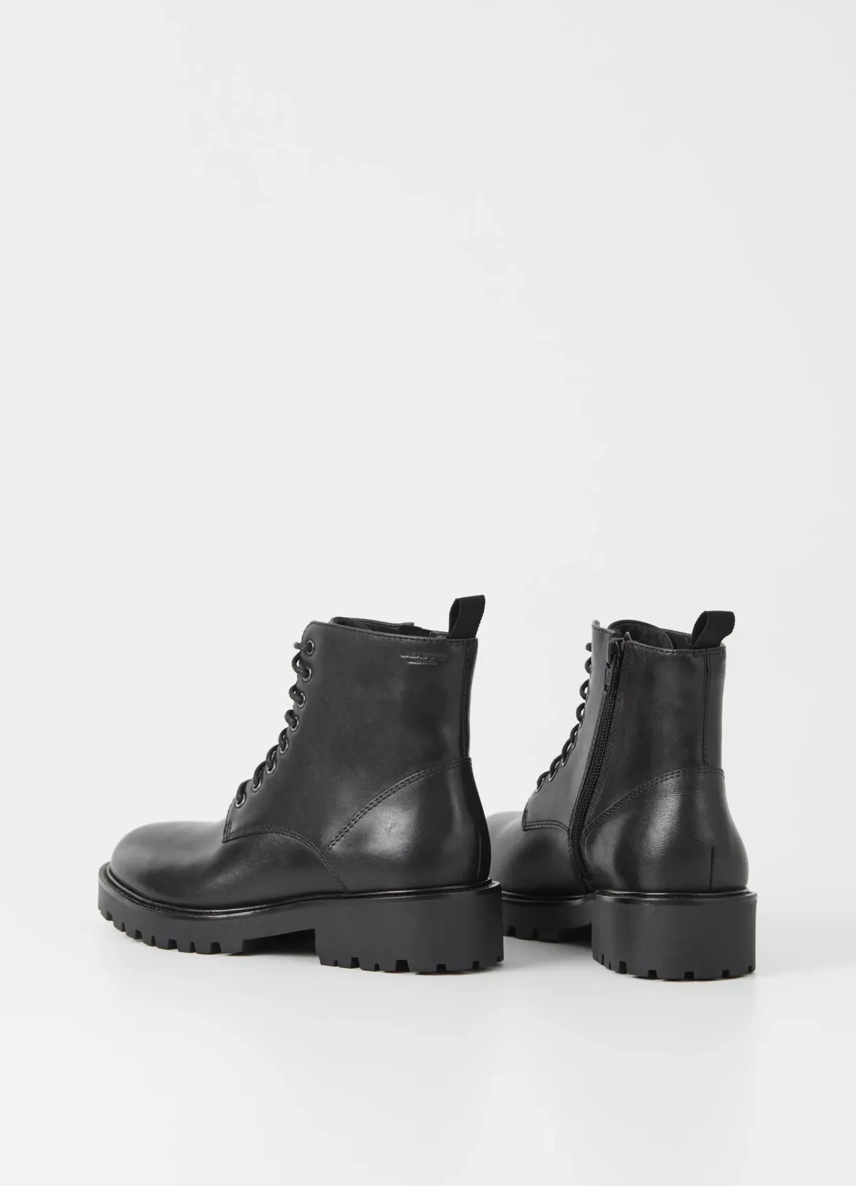 Kenova er en chunky version af de klassiske utility-boots. Modellen er i sort skind med rund tåform, lynlås og snøre fortil. Den kraftige ydersål har en robust hæl på 40 mm.