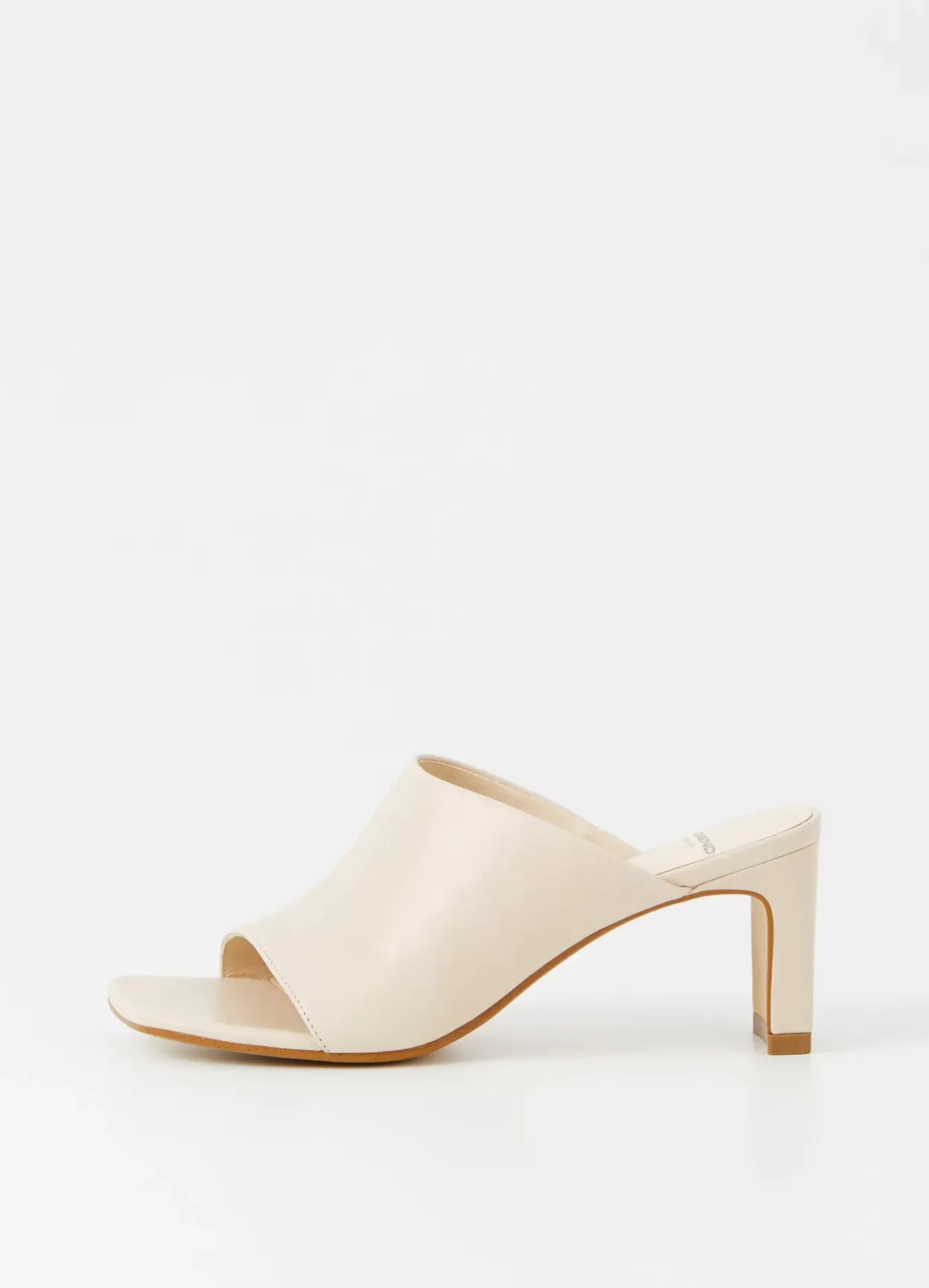 Luisa er højhælede mules med et minimalistisk design. Modellen er i offwhite læder med en lavt skåret overside, slip-in design og firkantet tå. De smalle blokhæle er på 76 mm.