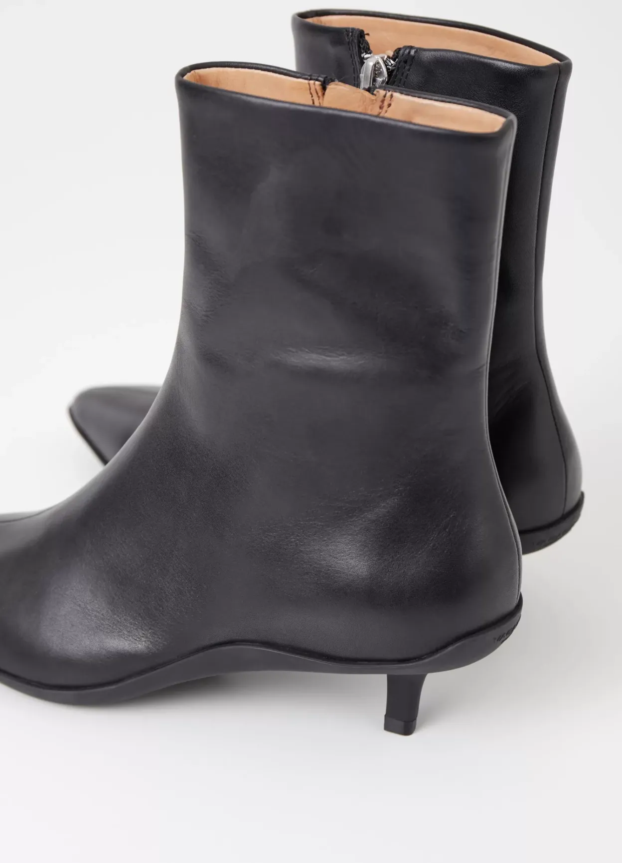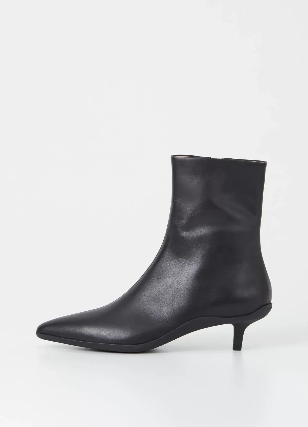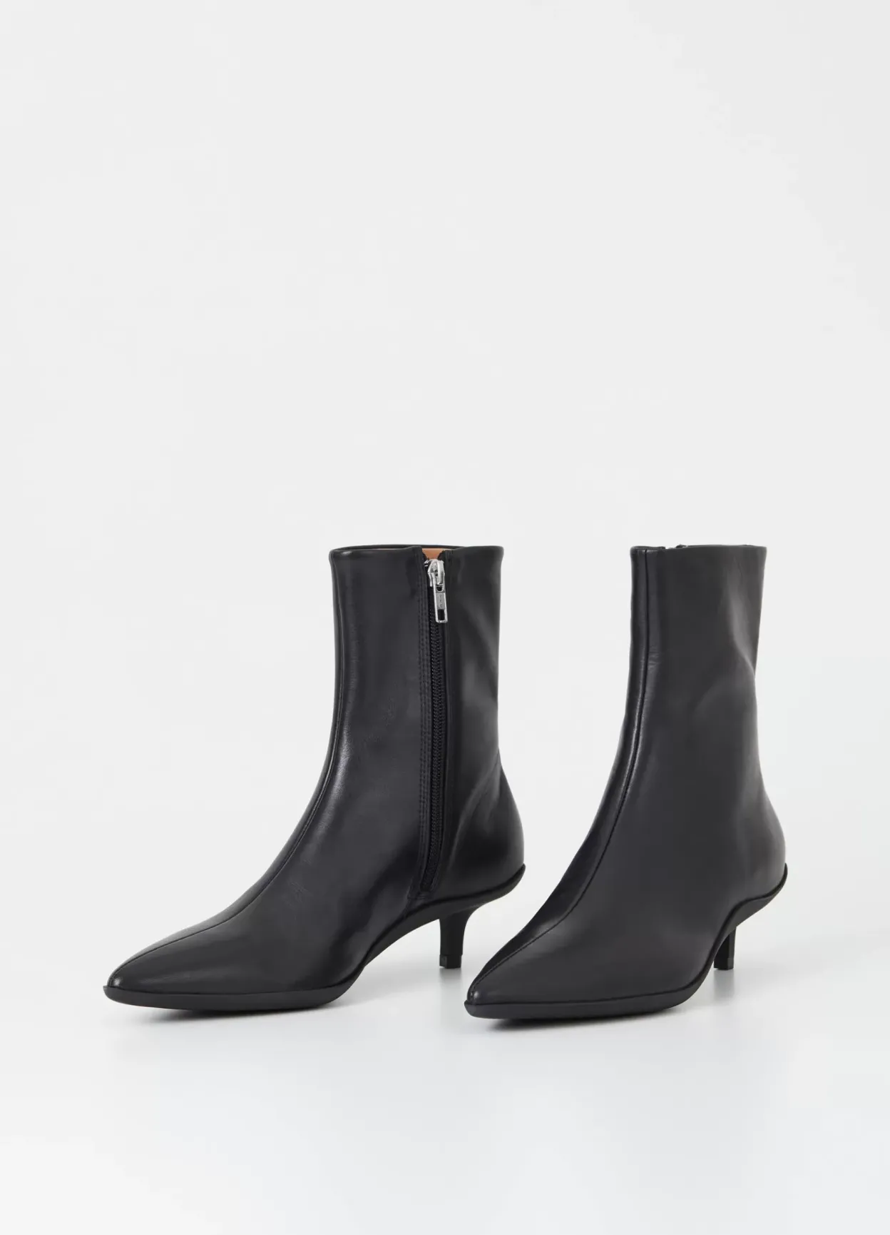 Lydia er stilrene ankelstøvler med en opdateret silhuet. Modellen er i sort skind med en spids tå, lynlås i skaftet og med skindfór. Den formstøbte sål har smalle hæle der er 40 mm høje.