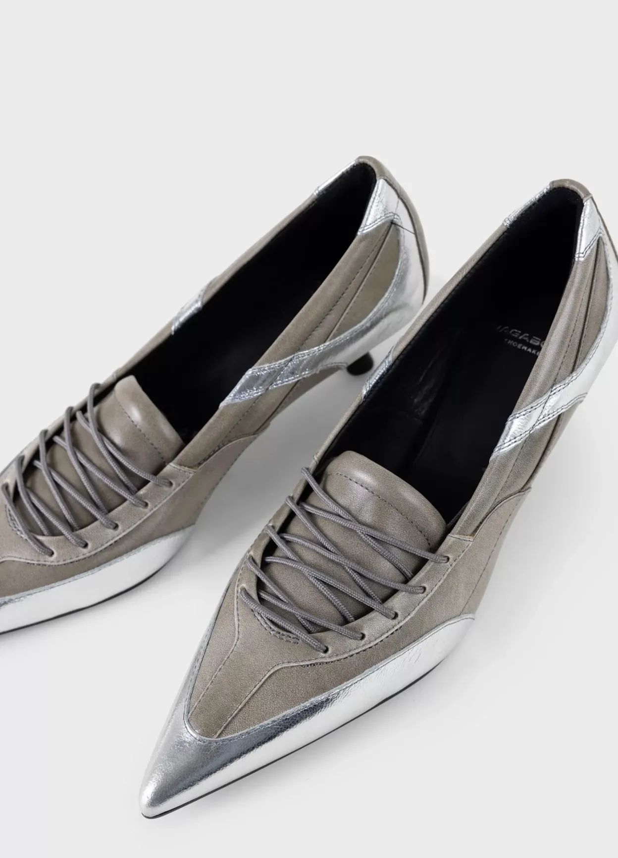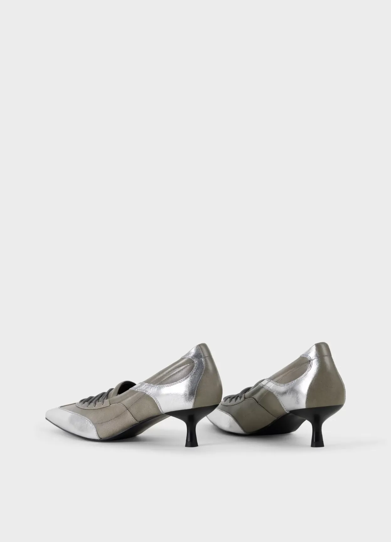 Lykke er sæsonens statement-pumps med et sportsinspireret design. Modellen er lavet i gråbeige læder med sølvfarvede paneler, kort snørebånd og spids tå. De smalle kitten-hæle er 47 mm. Detaljen: dekorative søm, læder/tekstilfor og indersål i læder.
