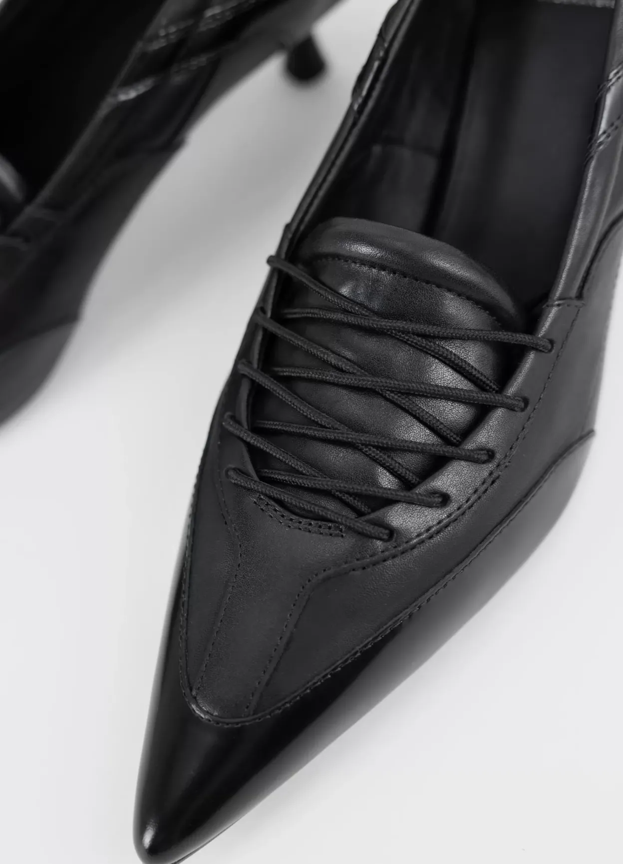 Lykke er sæsonens statement-pumps med et sportsinspireret design. Modellen er lavet i sort læder med paneler i laklæder, kort snørebånd og spids tå. De smalle kitten-hæle er 47 mm. Detaljen: dekorative søm, læder/tekstilfor og indersål i læder.