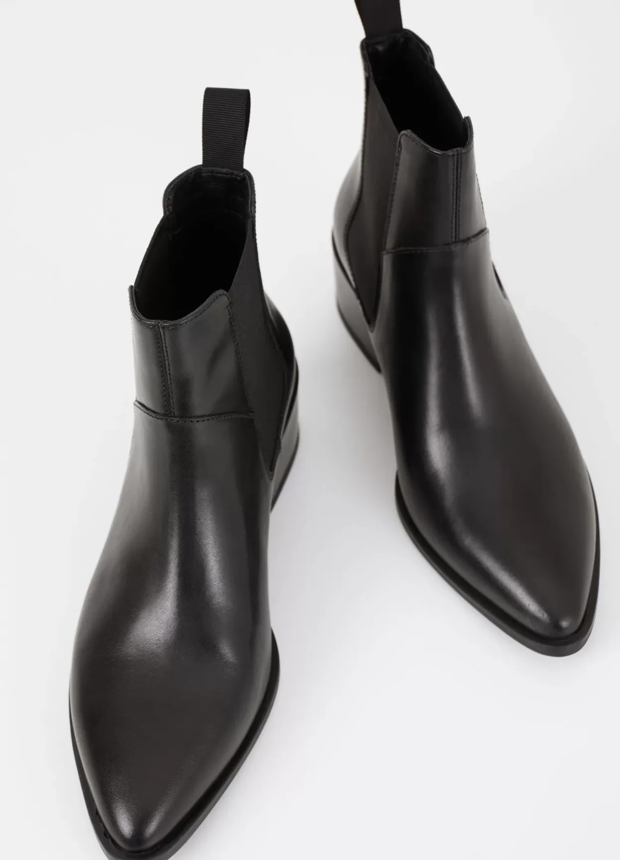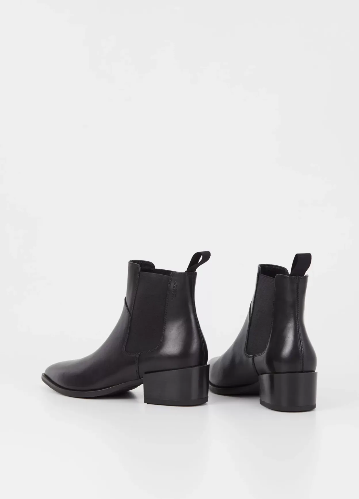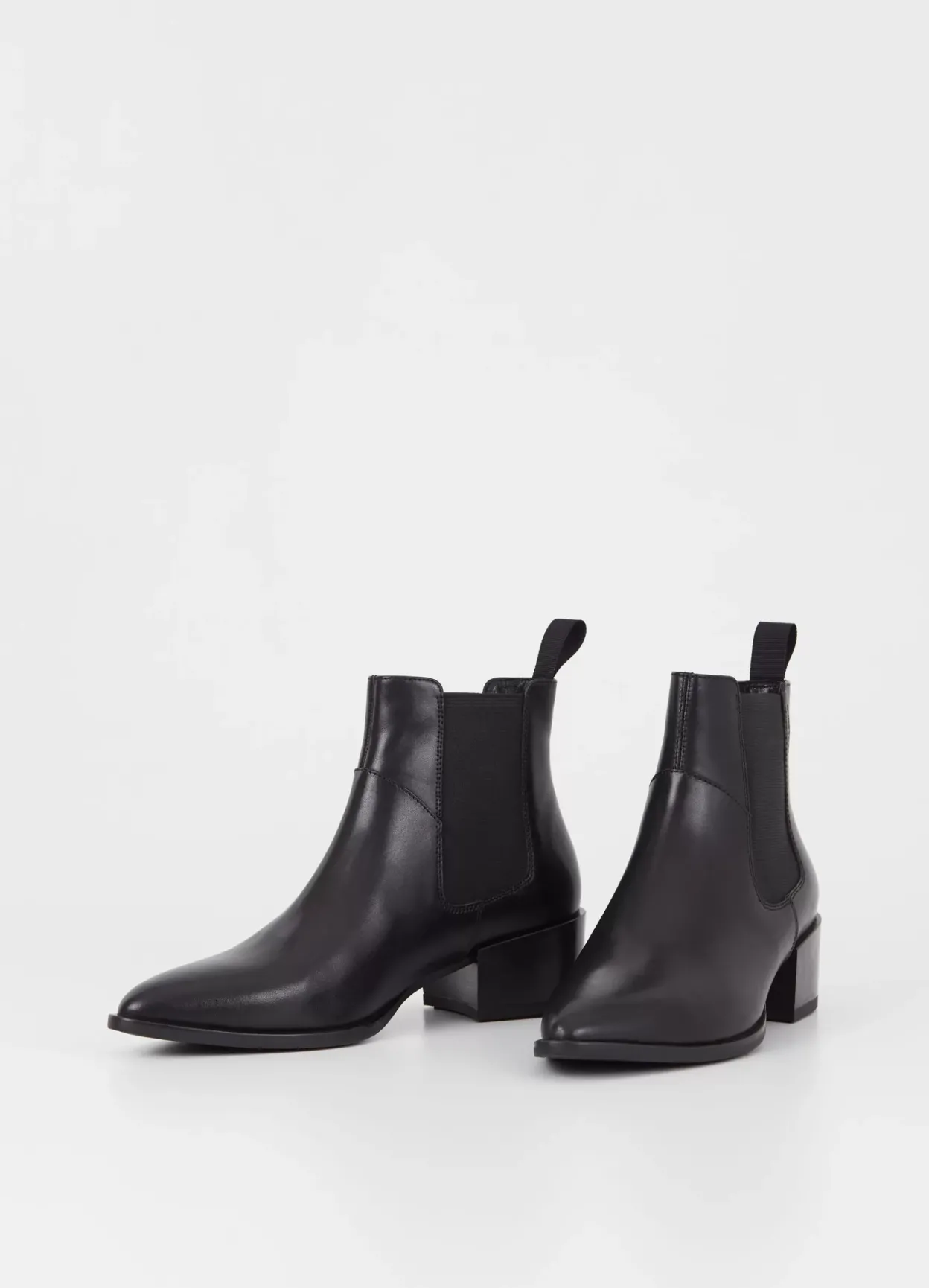 Marja is the classic Chelsea boots with an edgy appeal. The style is crafted from black leather with a pointed toe shape, elastic side panels and heel loop tabs. The block heels measure 47mm.