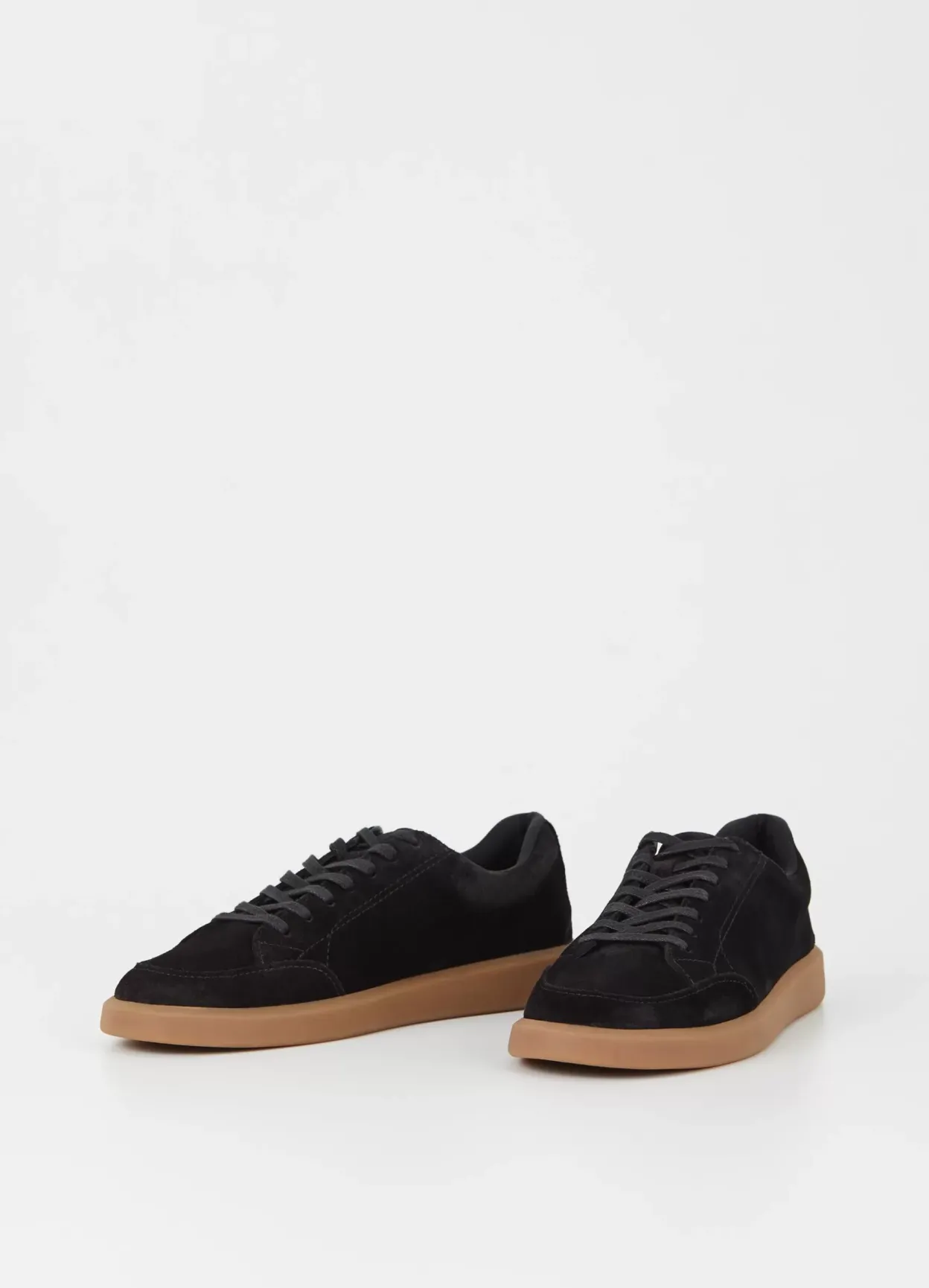 Maya er minimalistiske sneakers med et court-inspireret design. Oversiden er i sort ruskind med dekorative sømme og snørebånd. Den slanke sål er på 25 mm.