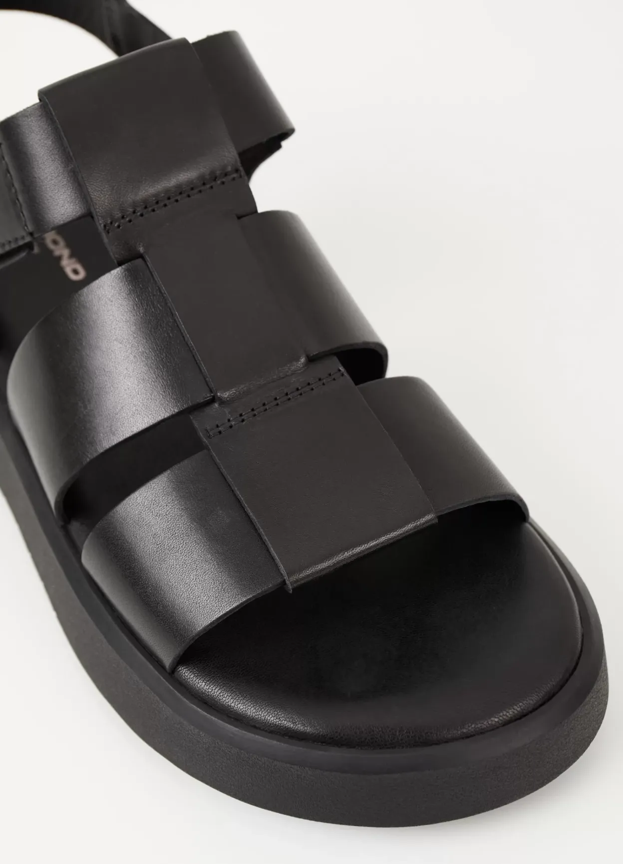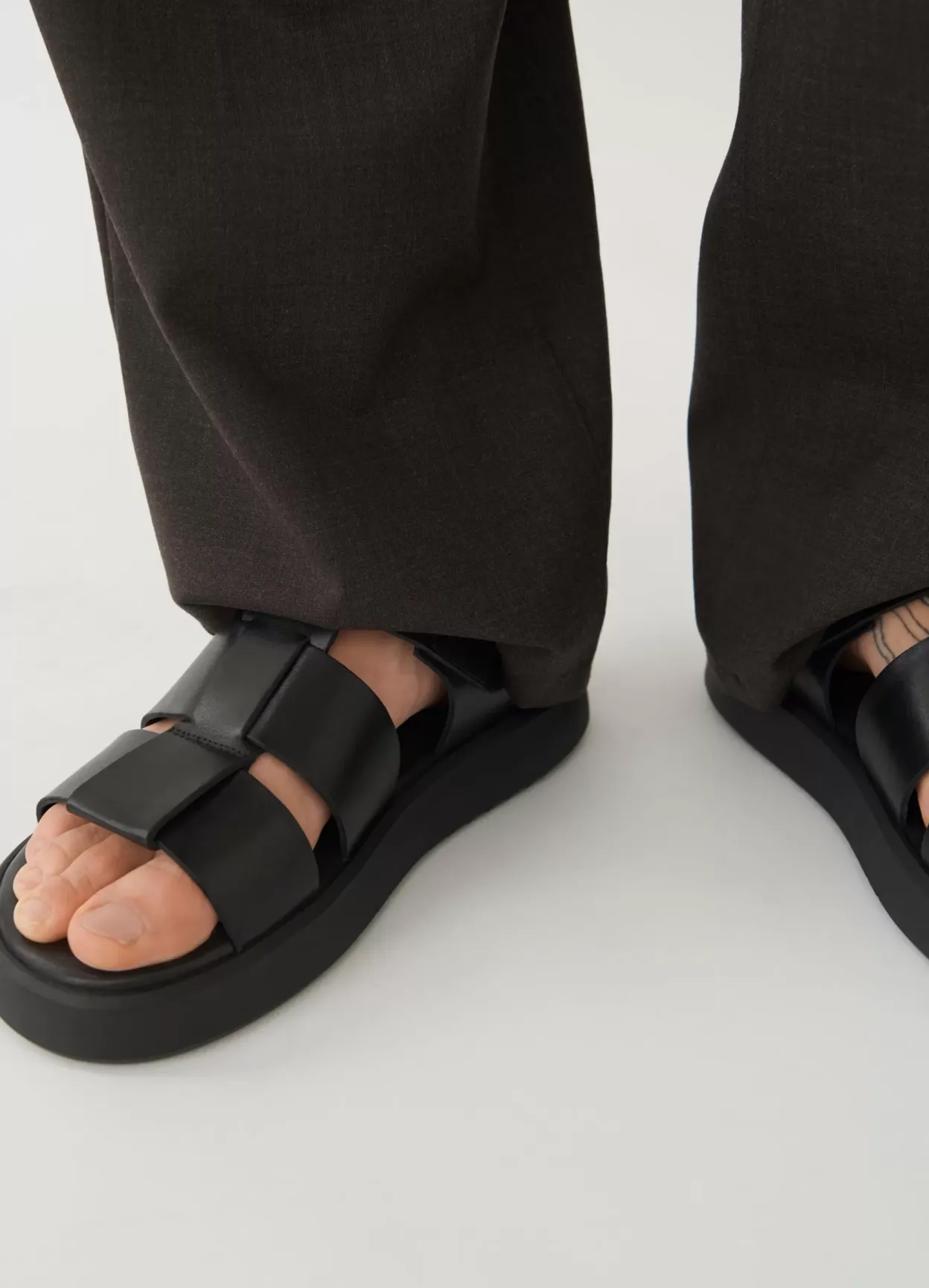 Nate er stilrene sandaler med en opdateret silhuet. Modellen er i sort skind med flettede remme over foden, hælrem med velcrolukning og en solid ydersål. Den runde sål er 40 mm høj.
