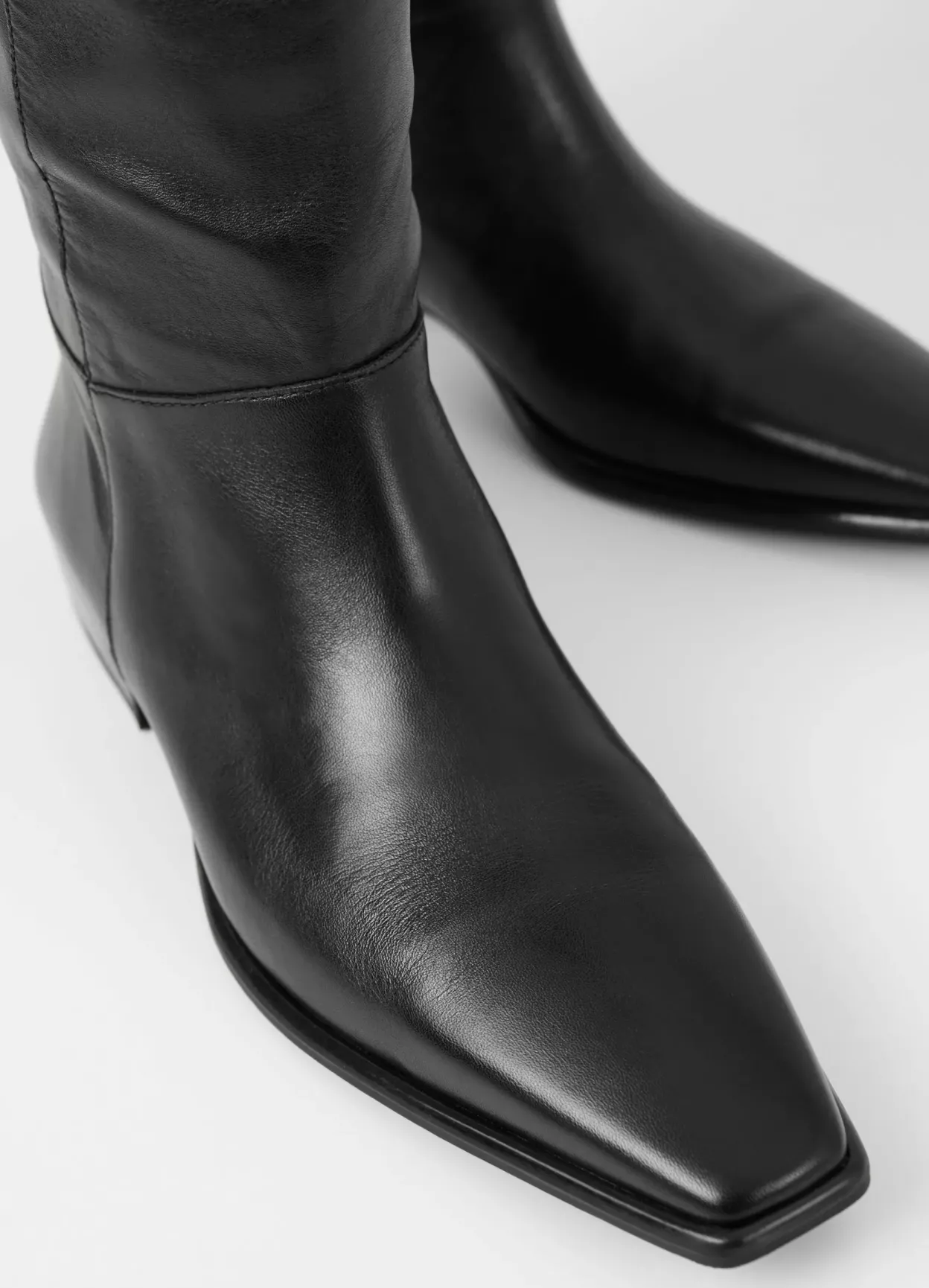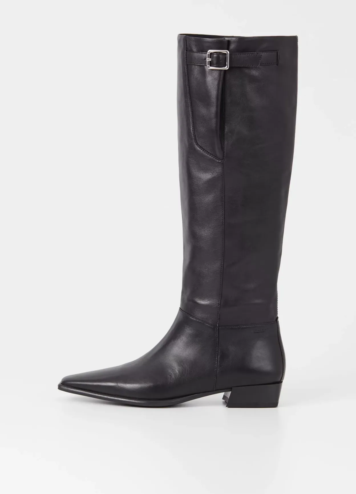 Nella er klædelige høje støvletter med et clean design. Modellen kommer i sort læder med spids tå, en dekorativ strop med spænde og pull-on skafte. Skrå blokhæl på 31 mm.