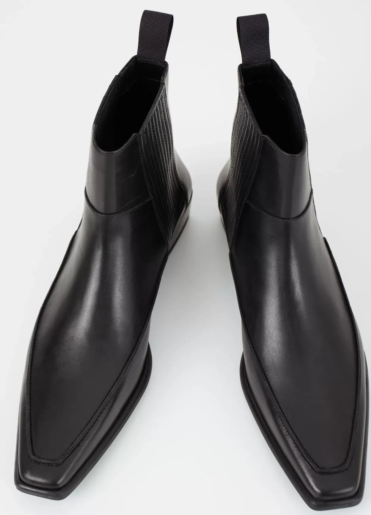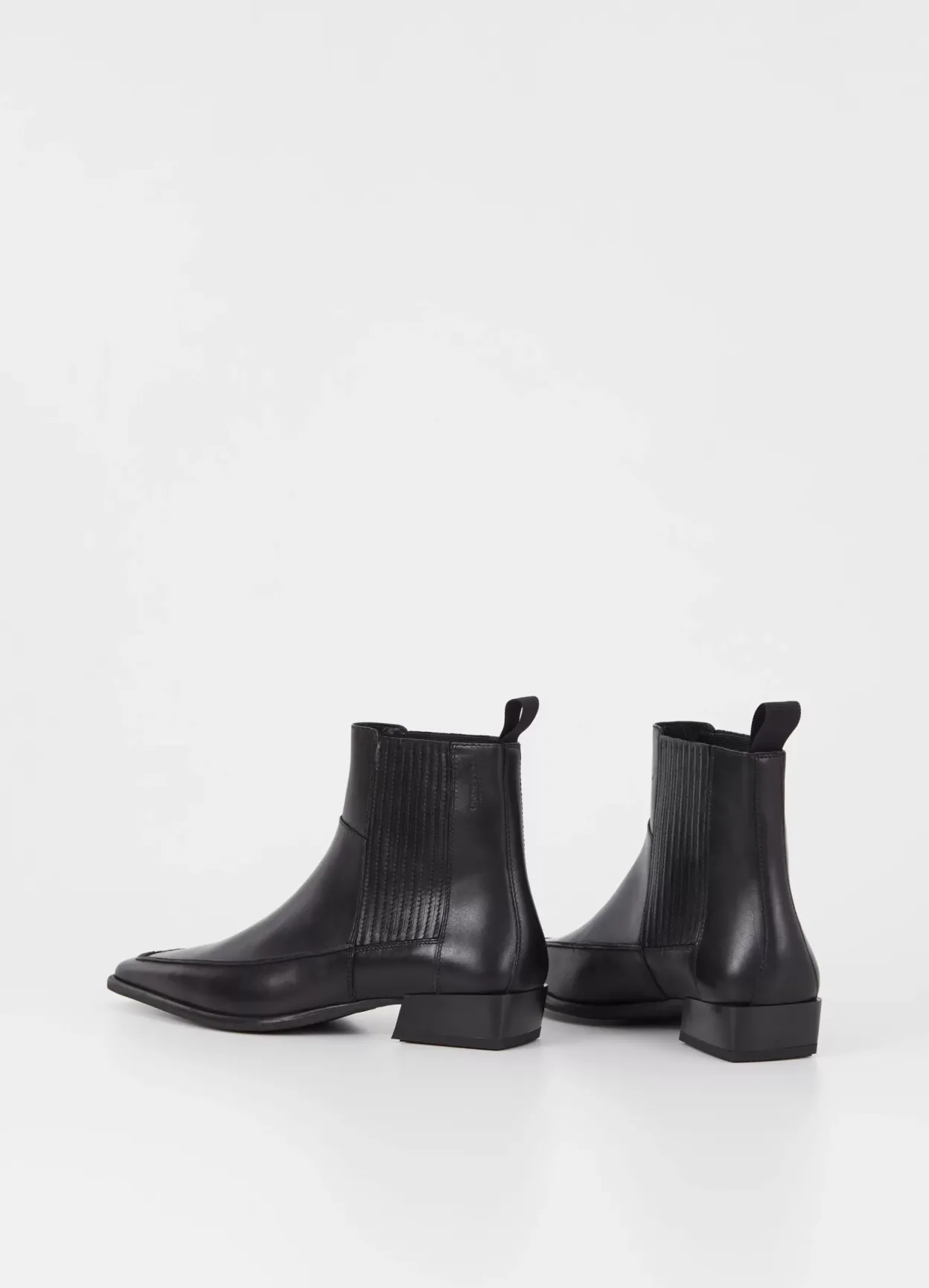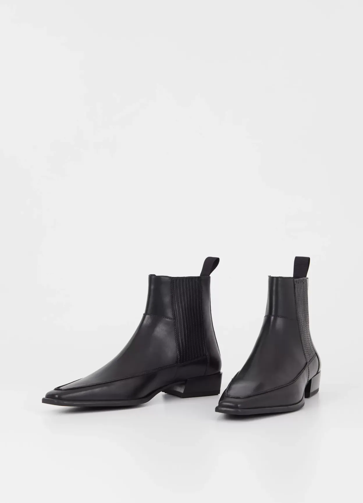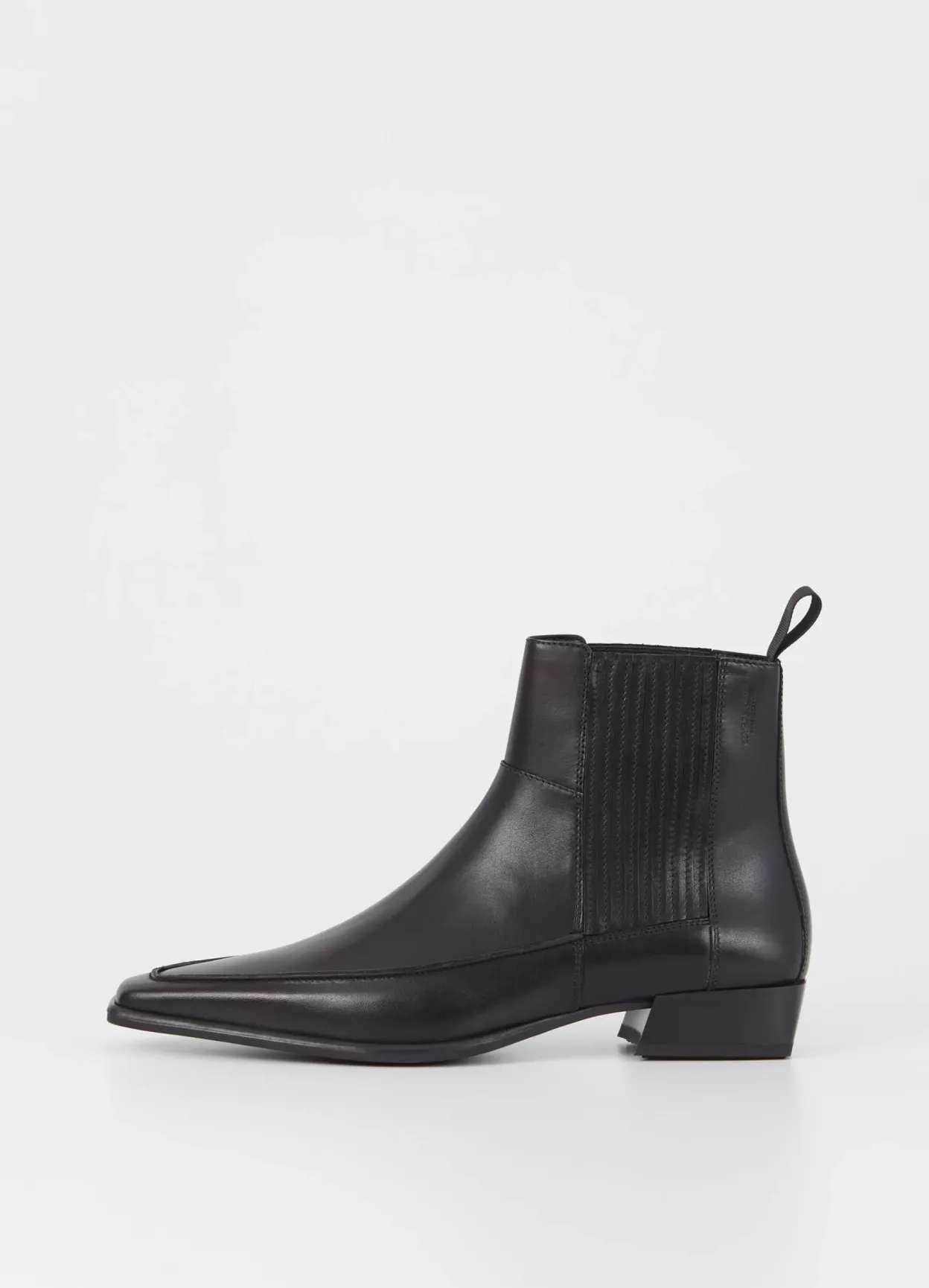 Nella is the refined western boot with a sleek silhouette. The style is crafted from black leather with a pointed-toe shape, pleated elastic side panels and decorative stitching along the upper. The slanted block heels measure 31mm. Details include heel loop tabs.