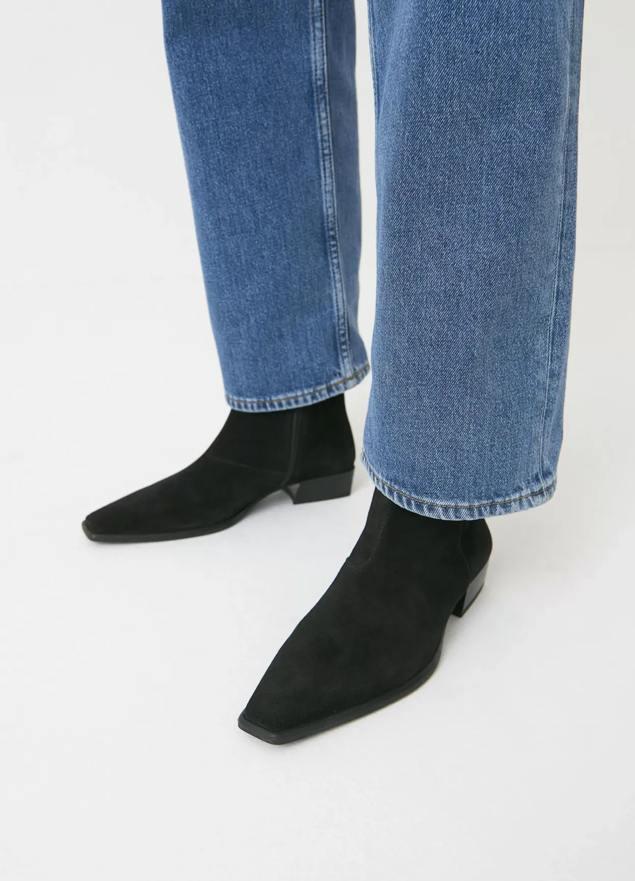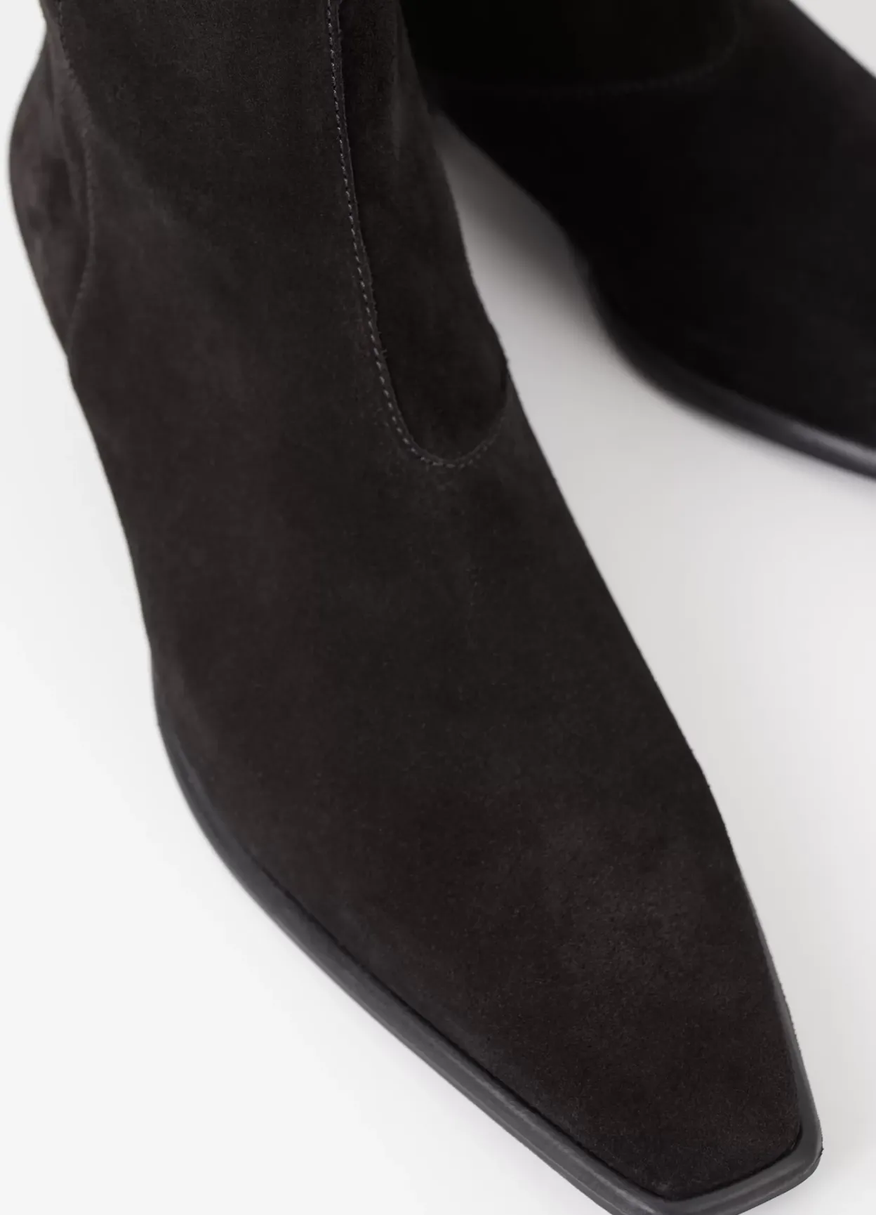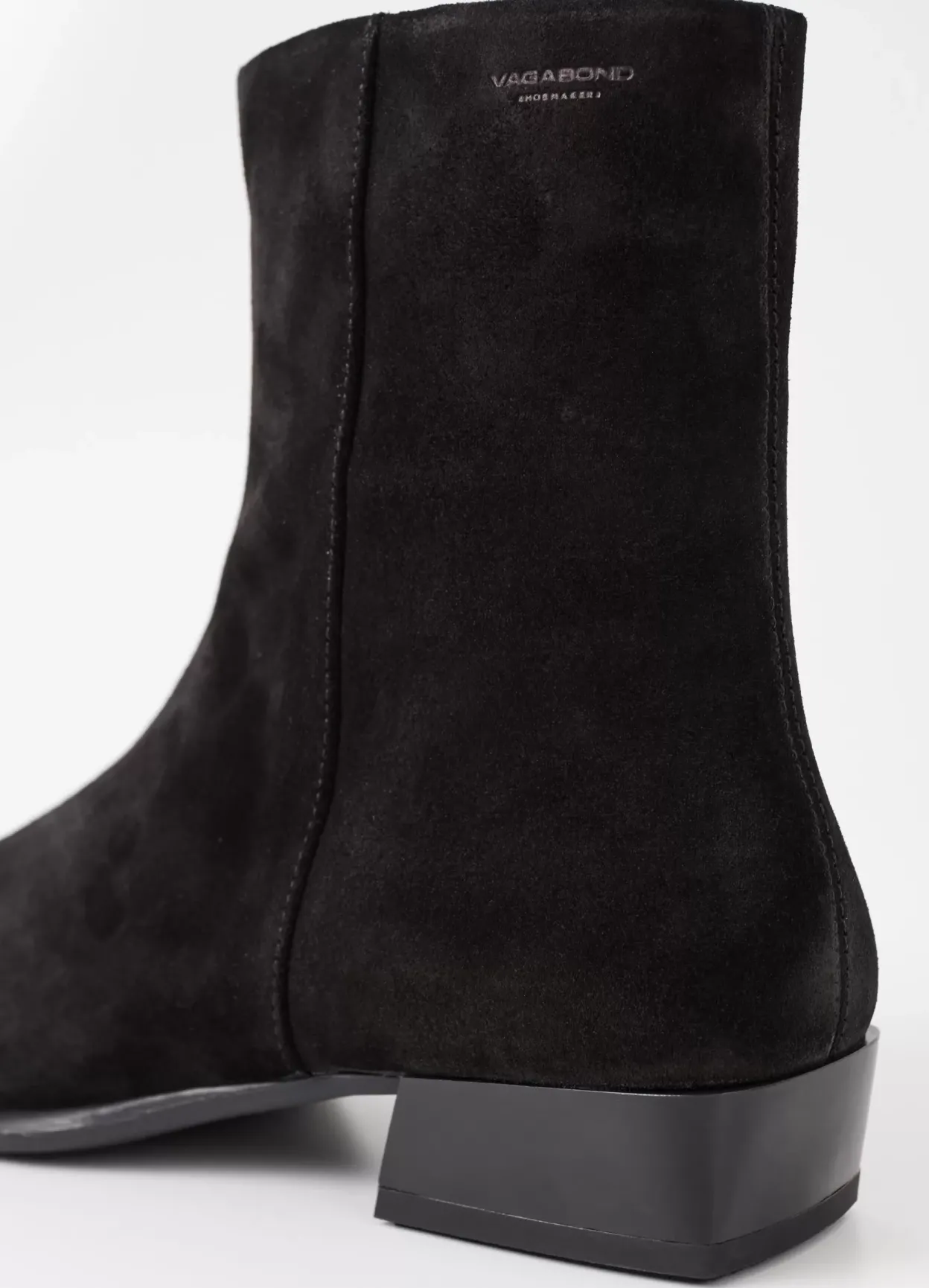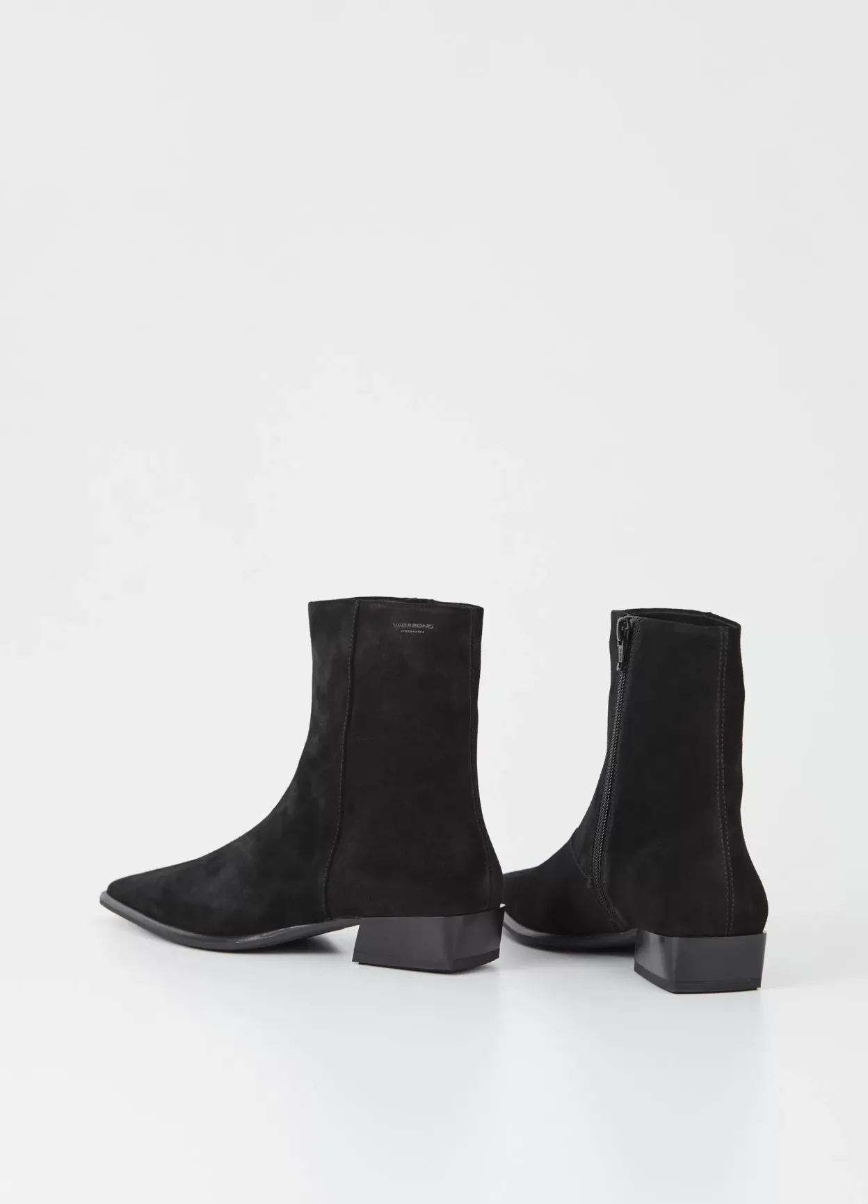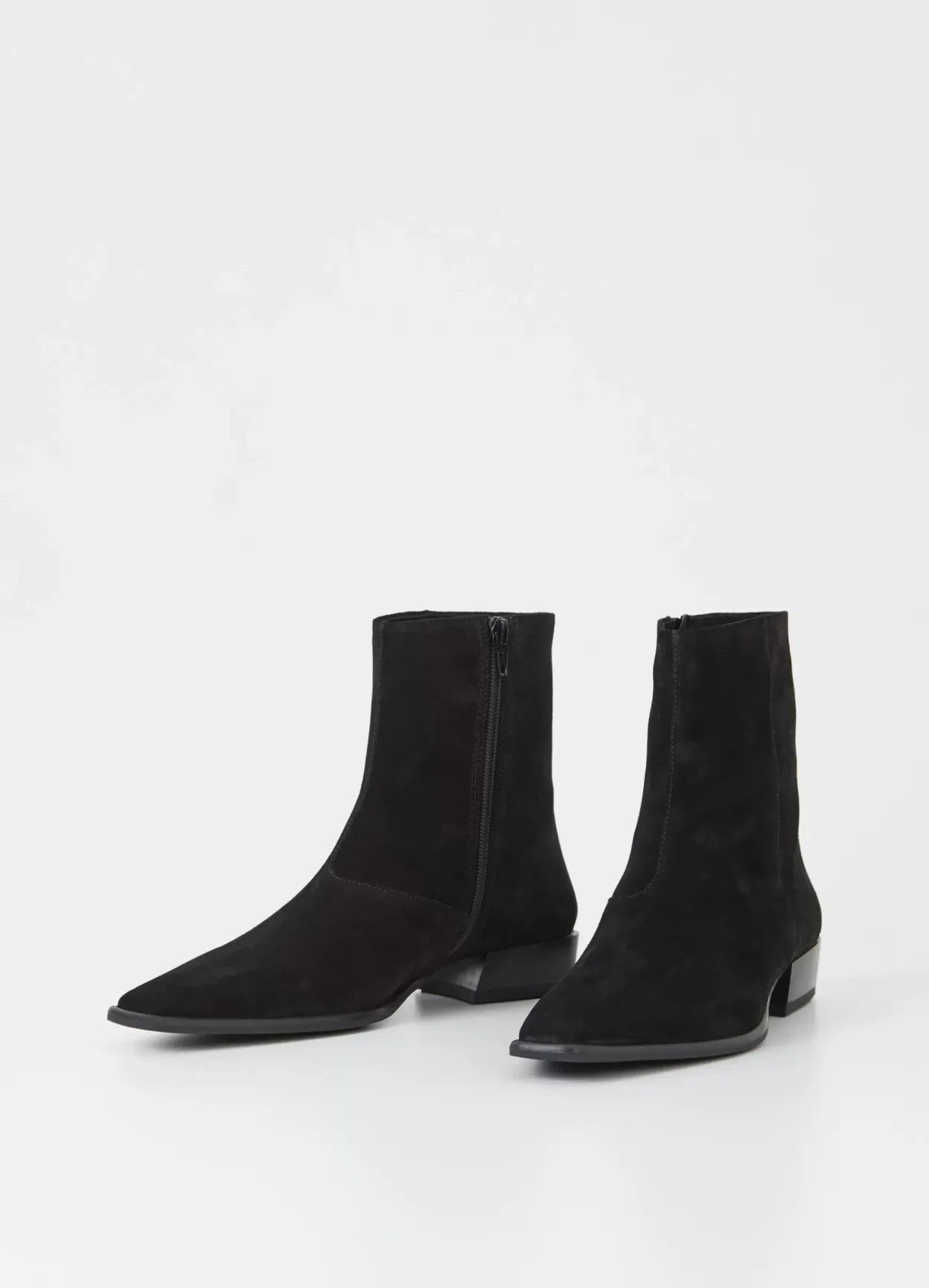 Nella er sofistikerede ankelstøvler med et opdateret look. Modellen er i sort ruskind med en spids tåform og lynlås langs med skaftet. Den lave hæl er på 31 mm.