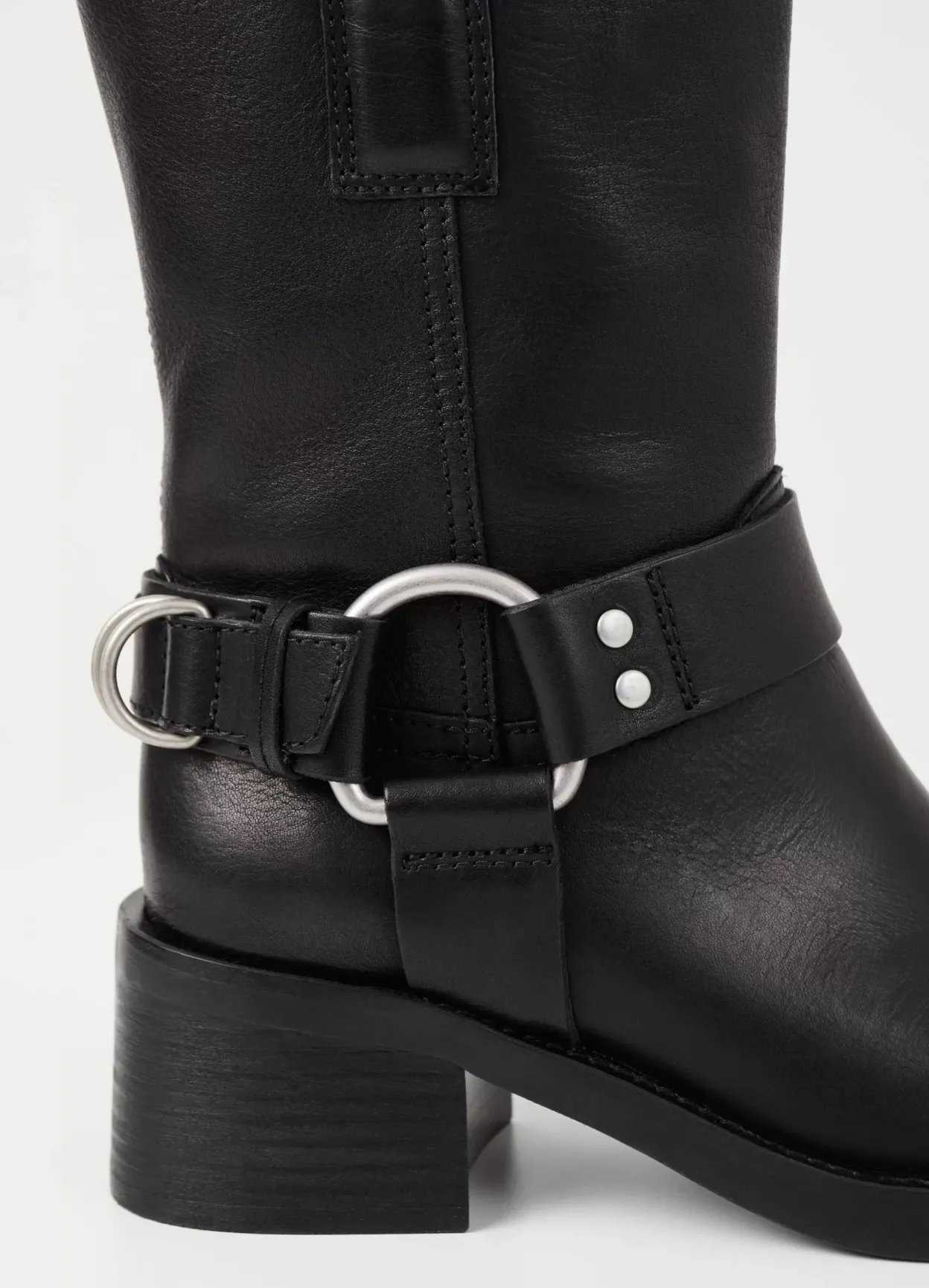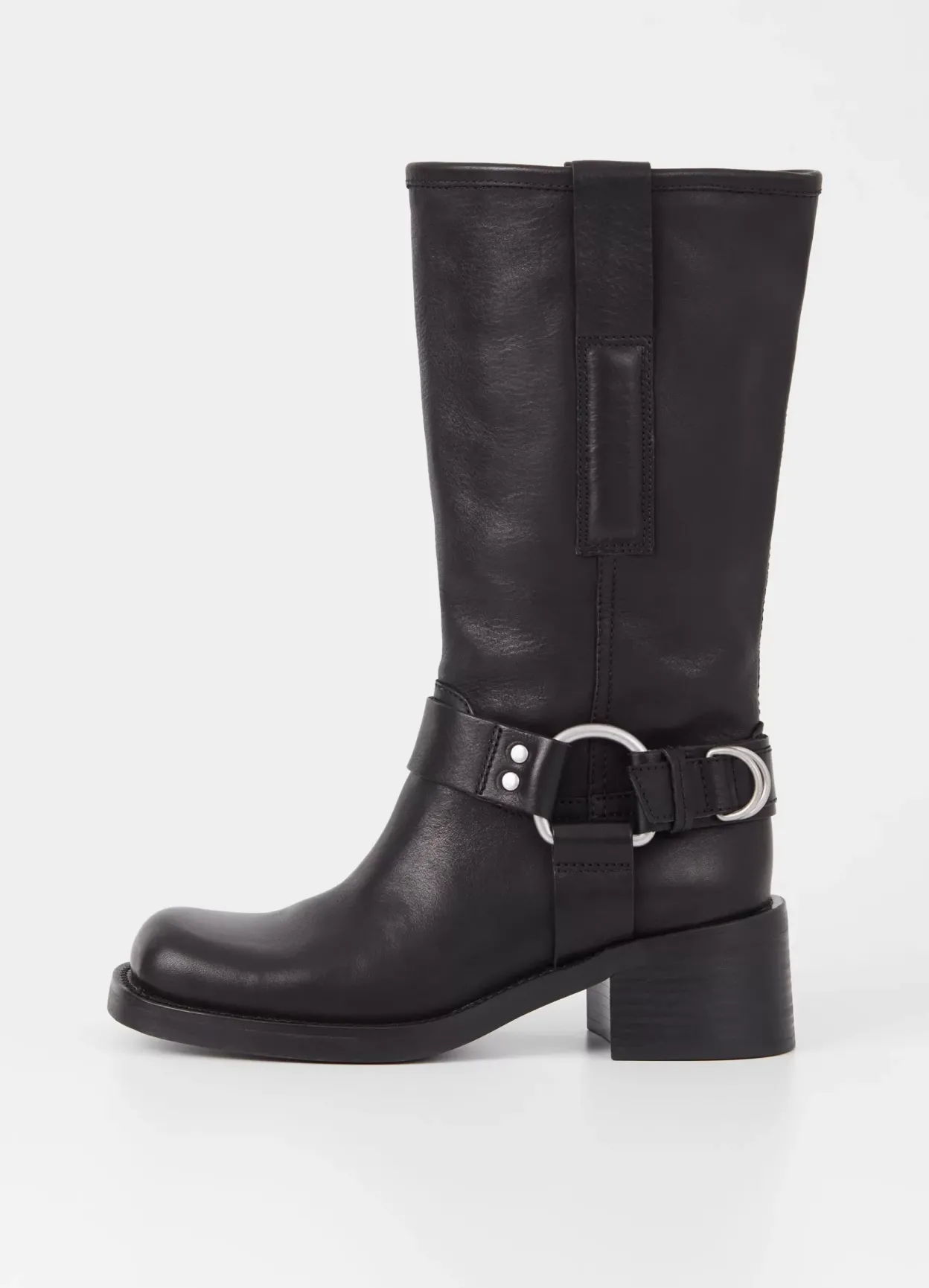 Nour er harness-støvler med et mc-inspireret design. Modellen kommer i sort læder med et mellemhøjt skafte samt pull-on design. Den formstøpte gummisål står på en 57 mm blokhæl. Detaljen: rund tå, læderfor og lynlåse langs med skaftet.