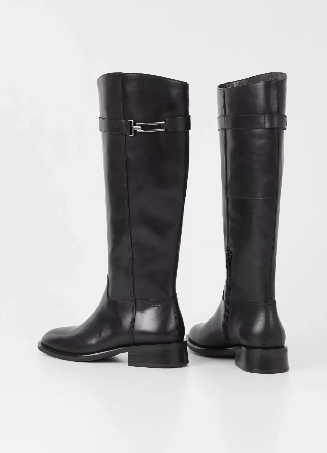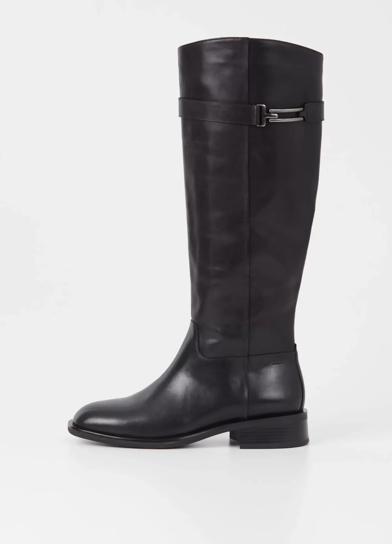 Sheila er knæhøje boots inspireret af klassiske ridestøvler. Modellen kommer i sort læder med en dekorativ strop med spænde øverst. Den lave hæl måler 38 mm. Detaljen: lynlås langs indersiden af skaftet.