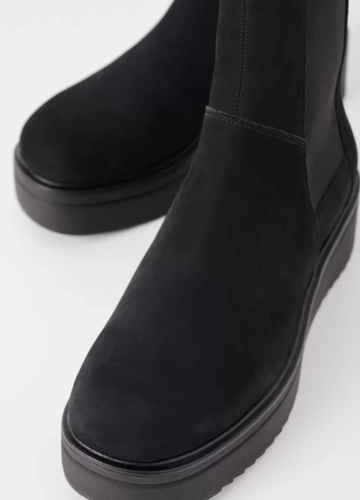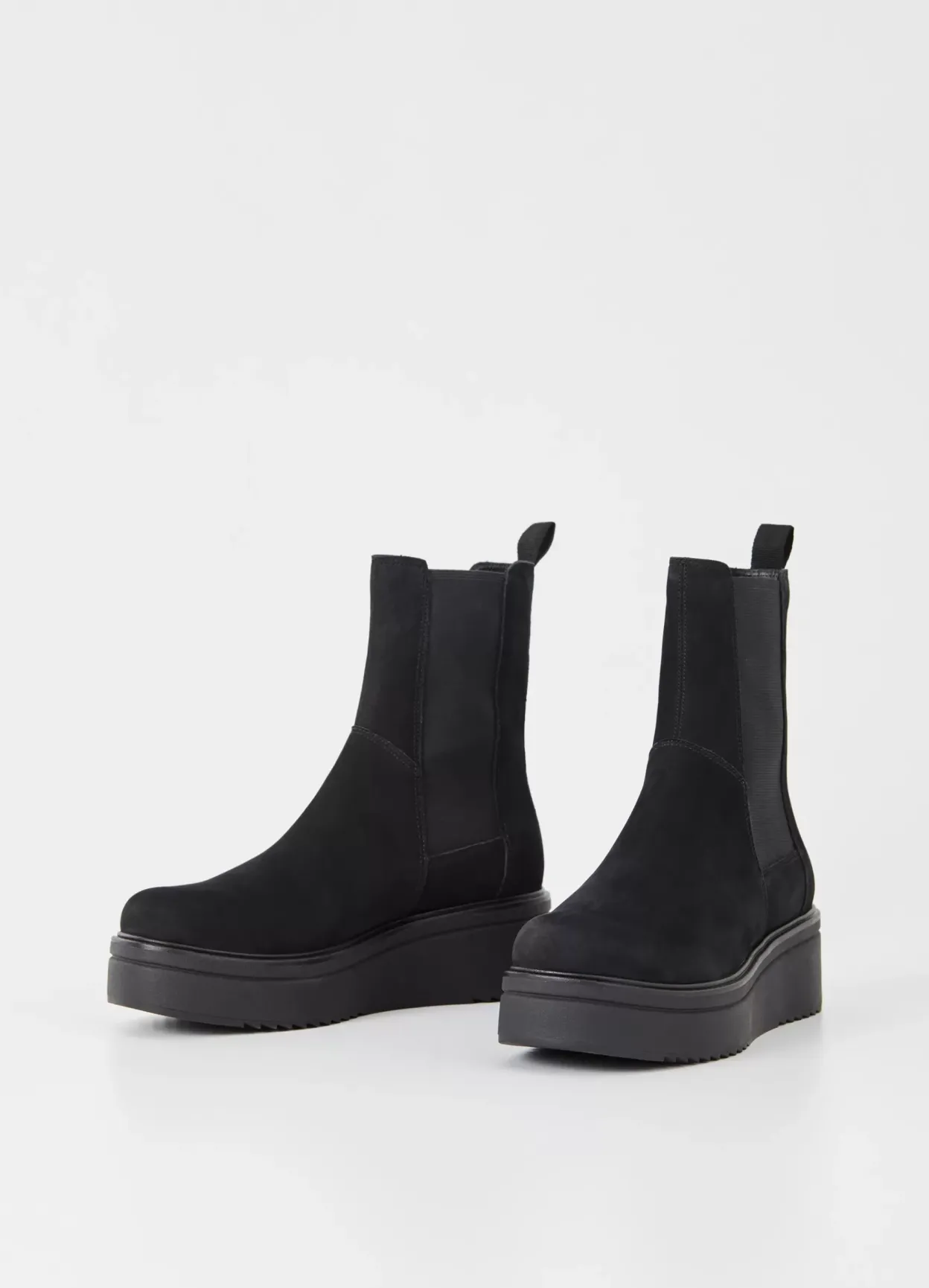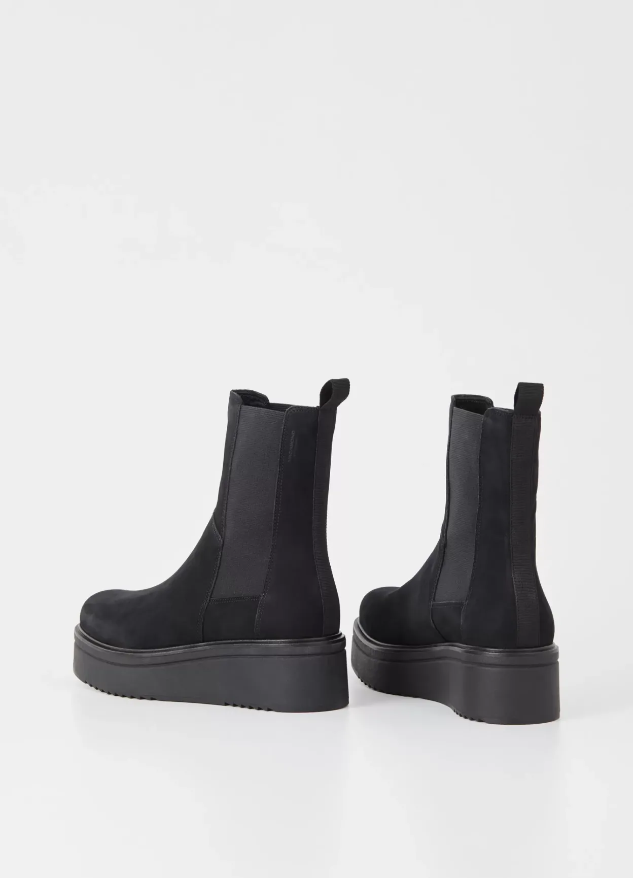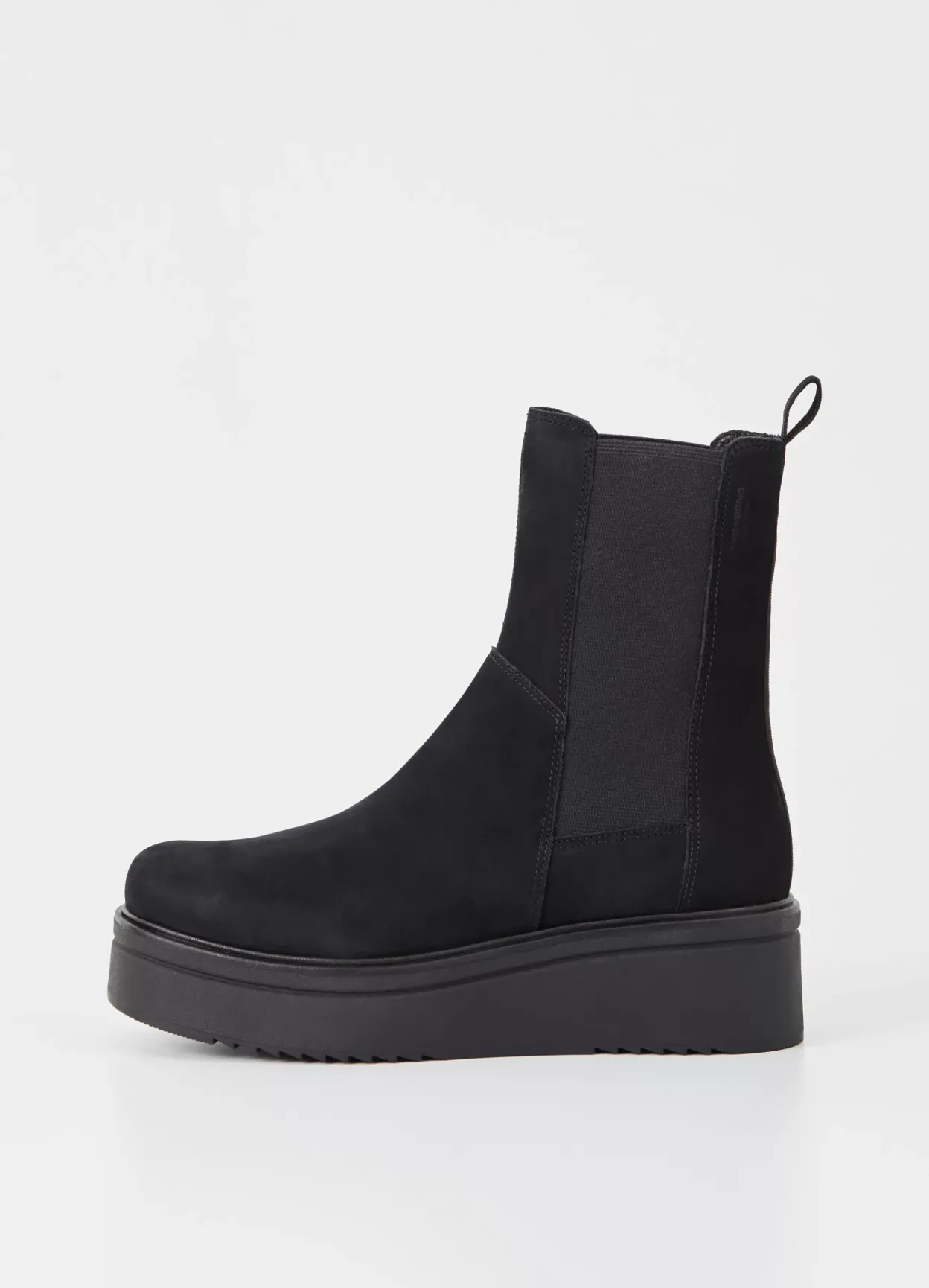 Tara er vores opdaterede Chelsea støvle med en moderne plateau-silhuet. Modellen er i sort nubuck med elastikpaneler i siden af skaftet, rund tå og trækflap. Den høje plateausål er på 55 mm.