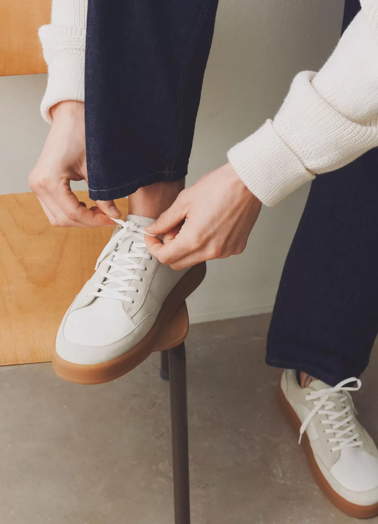 Teo er tidløse sneakers inspireret af klassiske army trainers. Modellen er lavet i hvidt læder med paneler i gråbeige ruskind og snørebånd. Den solide gummisål er 35 mm.