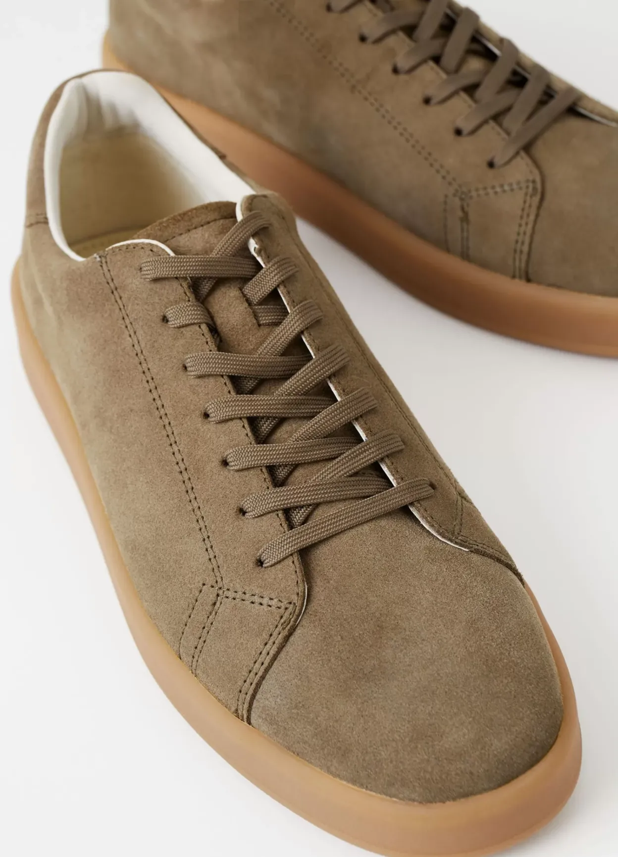 Teo er klædelige sneakers inspireret af klassiske army trainers. Modellen er lavet i khakigrønt ruskind med en minimalistisk overdel og snørebånd. Den solide gummisål er 35 mm.