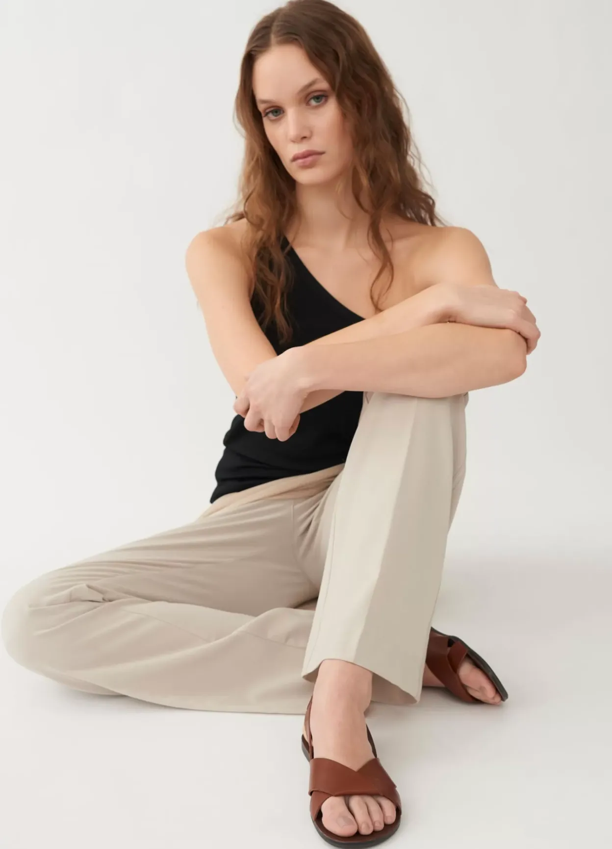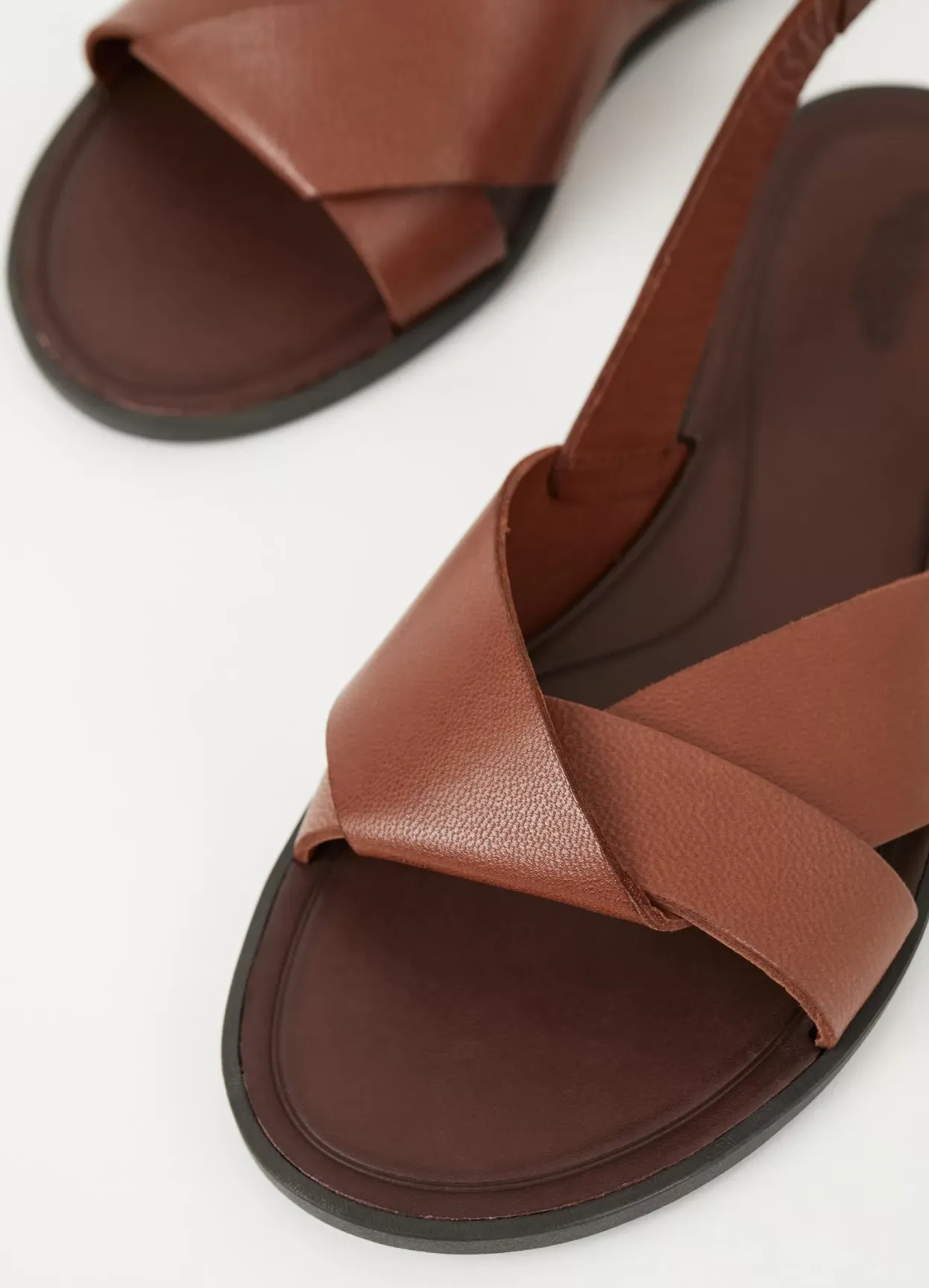 Tia 2.0 er minimalistiske sandaler med et stilrent design. Modellen er i cognacfarvet læder med flettede remme, åben tå og en elastisk hælrem. Den slanke sål er 10 mm.