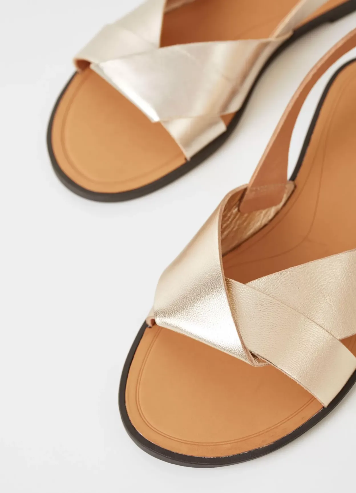 Tia 2.0 er stilfulde sandaler i et rent design. Modellen er lavet i guldfarvet læder med sammenflettede remme over foden, elastisk hælrem og åben tå. Den slanke sål er 10 mm.