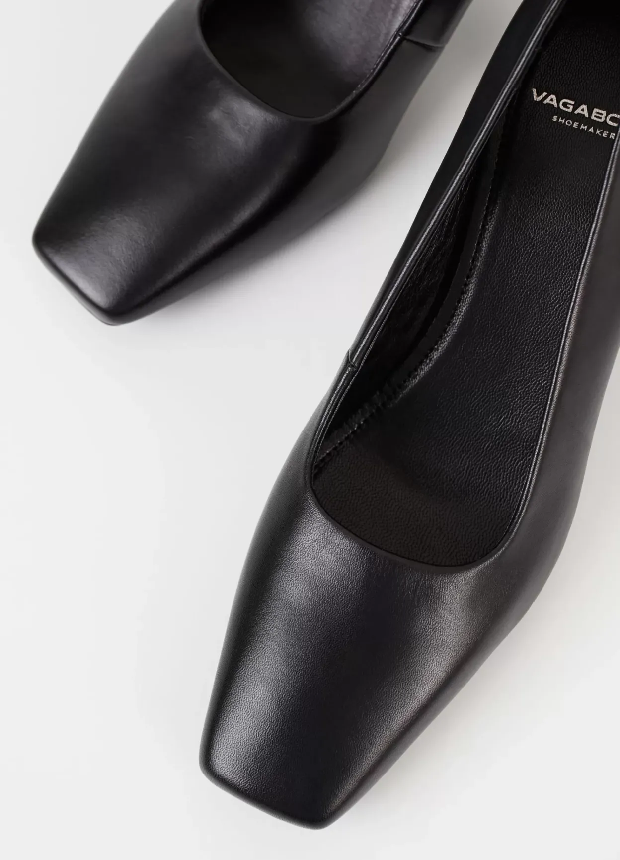 Vendela er tidløse pumps med et elegant look. Modellen er lavet i sort læder med firkantet tå, indersål i læder og læder/tekstilfor. Den smalle, karakteristiske hæl er 65 mm.