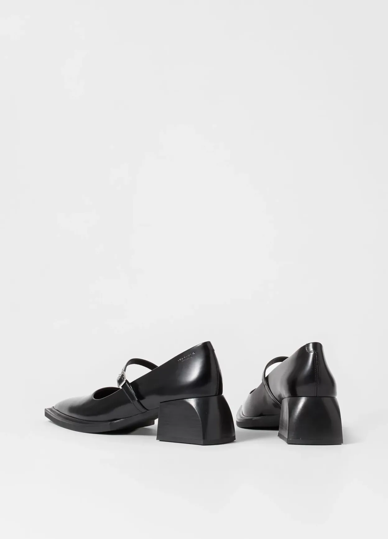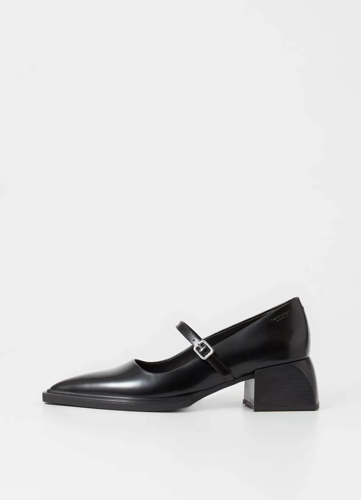 Vivian er fine Mary Jane pumps med en moderne silhuet. Modellen er i sort poleret laklæder med en spids tåform samt elegant ankelrem med sølvfarvet spænde. Den skulpturerede hæl er 55 mm.