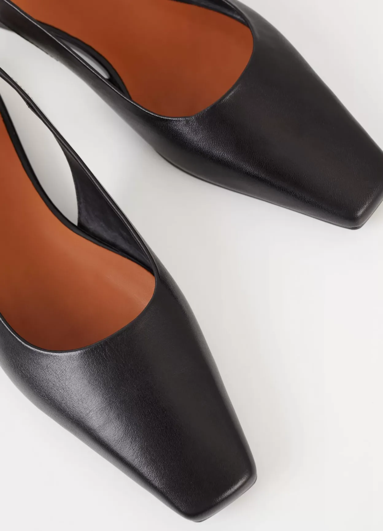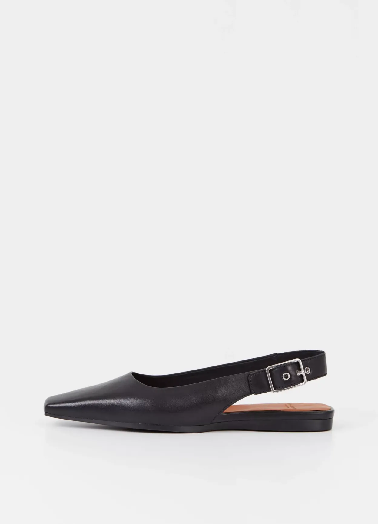 Wioletta er stilfulde slingbacks med et moderigtigt præg. Modellen er lavet i sort læder med spids tåform, justerbar hælrem og læderforing. Hælremmen lukkes med en sølvfarvet spænde i metal. Den lave hæl er 11 mm.