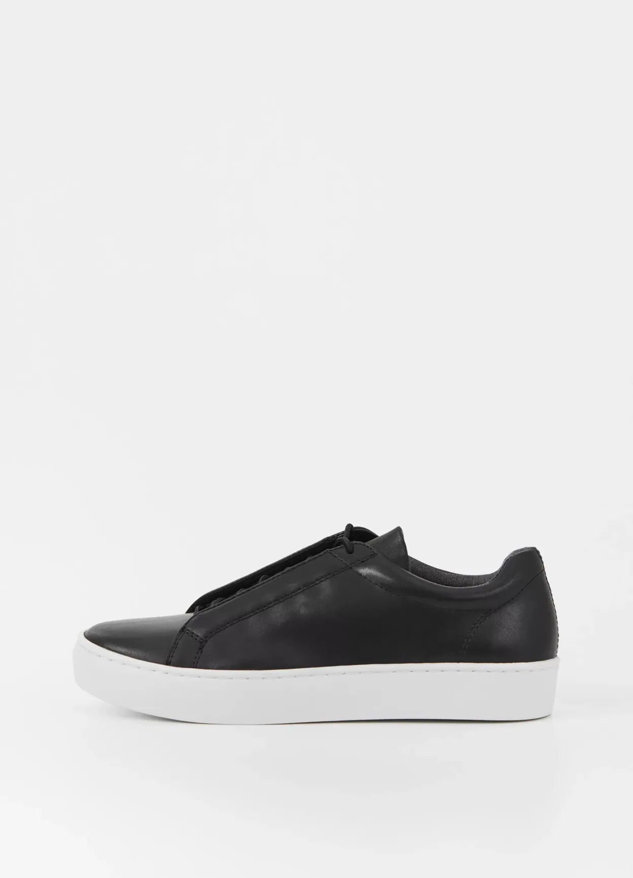 Zoe er tidløse hverdagssneakers med en minimalistisk silhuet. Oversiden er i sort læder med rund tåform, skjult snøre og tynde snørebånd i bomuld. Den slanke sål er på 29 mm.